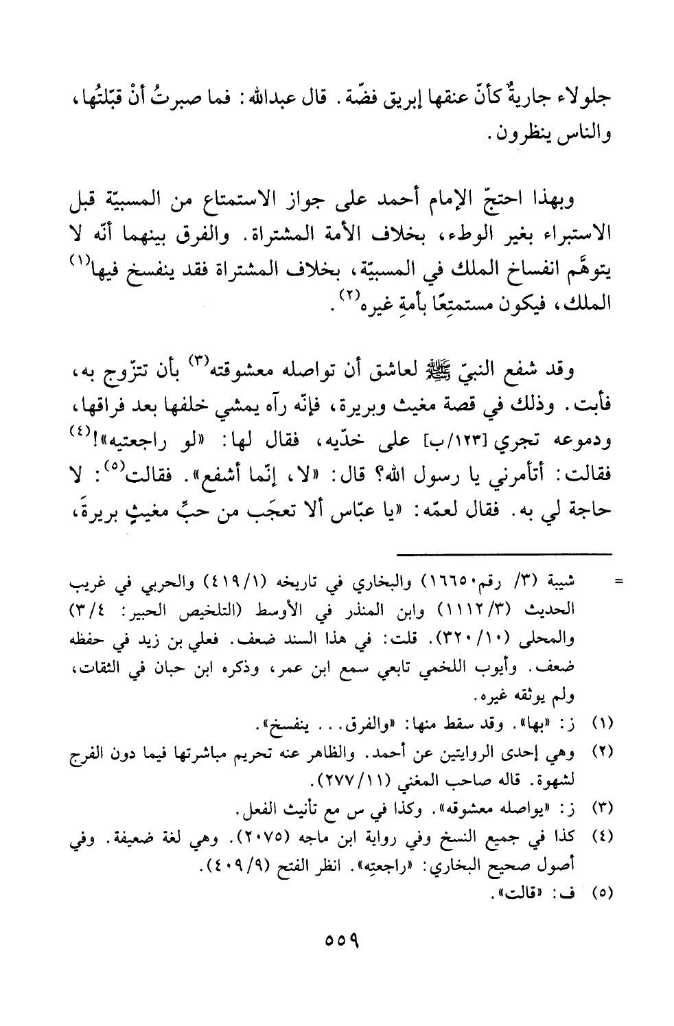 وقد شفع النبيّ - صلى الله عليه وسلم - لعاشق أن تواصله معشوقته (¬3) بأن تتزّوج به، فأبت. وذلك في قصة مغيث وبريرة، فإنّه رآه يمشي خلفها بعد فراقها، ودموعه تجري [123/ ب] على خدّيه، فقال لها: "لو راجعتيه"! (¬4) فقالت: أتأمرني يا رسول الله؟ قال: "لا، إنّما أشفع". فقالت (¬5): لا حاجة لي به. فقال لعمّه: "يا عبّاس ألا تعجَب من حبِّ مغيثٍ بريرةَ،