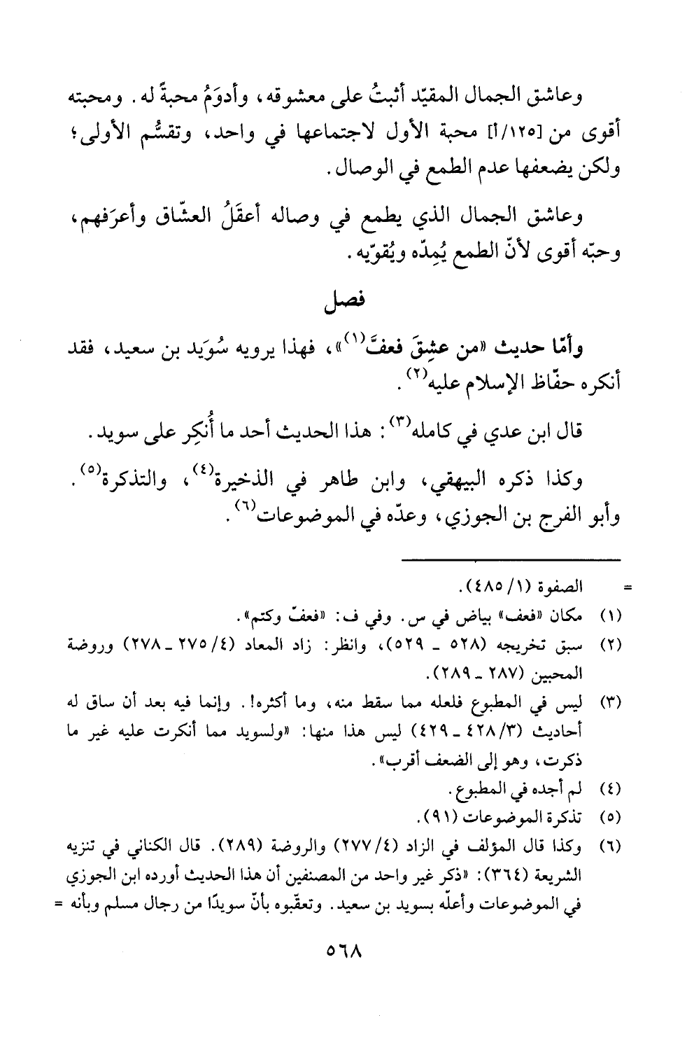 (¬6) وكذا قال المؤلف في الزاد (4/ 277) والروضة (289). قال الكناني في تنزيه الشريعة (364): "ذكر غير واحد من المصنفين أن هذا الحديث أورده ابن الجوزي في الموضوعات وأعله بسويد بن سعيد. وتعقّبوه بان سويدًا من رجال مسلم وبأنه =
