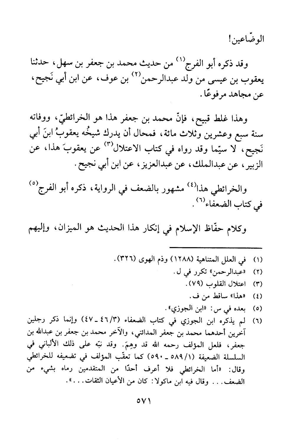 (¬6) لم يذكره ابن الجوزي في كتاب الضعفاء (3/ 46 - 47) وإنما ذكر رجلين آخرين أحدهما محمَّد بن جعفر المدائني، والآخر محمَّد بن جعفر بن عبد الله بن جعفر، فلعل المؤلف رحمه الله قد وهِمَ. وقد نبّه على ذلك الألباني في السلسلة الضعيفة (1/ 589 - 590) كما تعقّب المؤلف في تضعيفه للخرائطي وقال: "أما الخرائطي فلا أعرف أحدًا من المتقدمين رماه بشيء من الضعف ... وقال فيه ابن ماكولا: كان من الأعيان الثقات ... ".