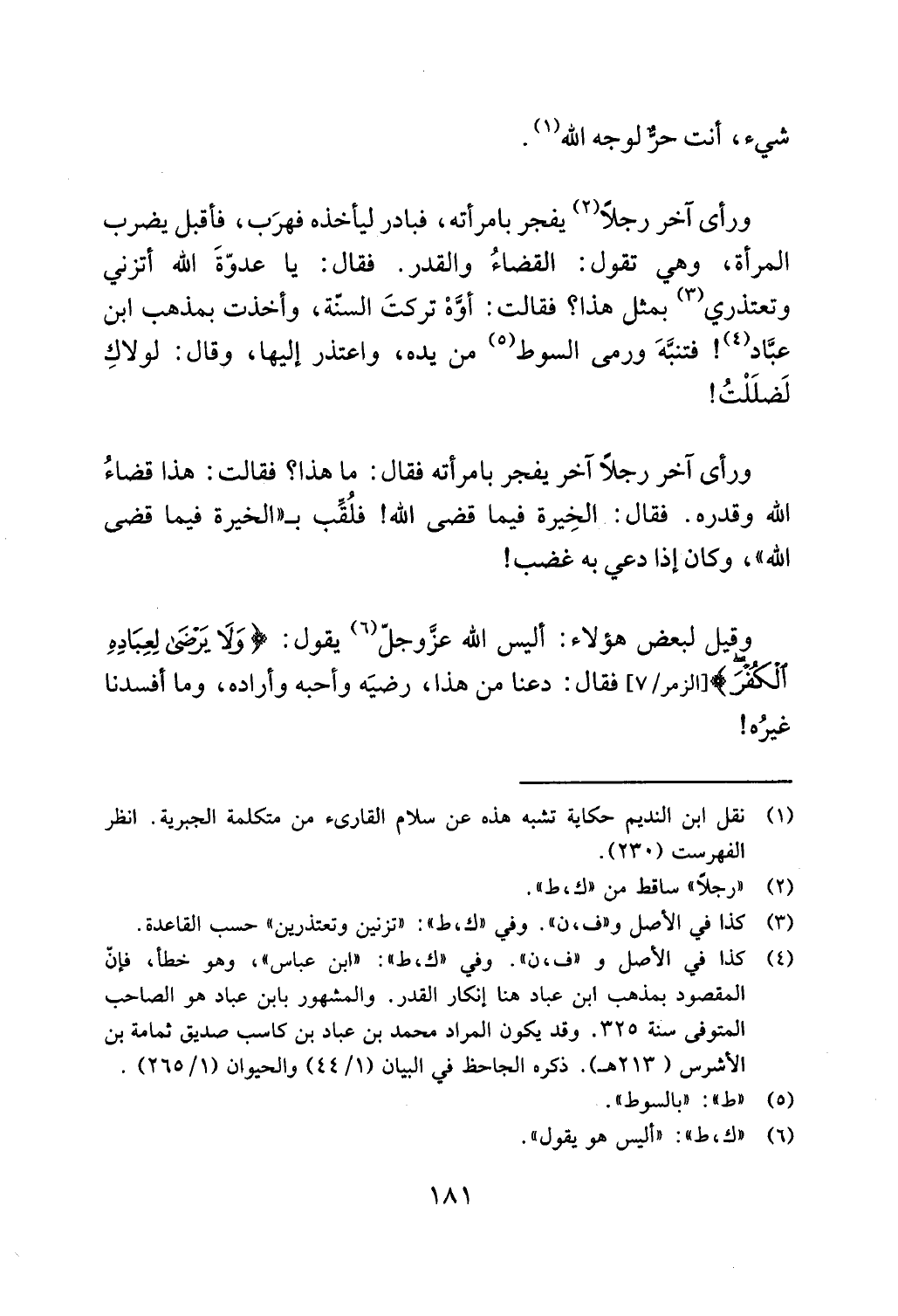 نقل ابن النديم حكاية تشبه هذه عن سلام القارىء من متكلمة الجبرية. انظر