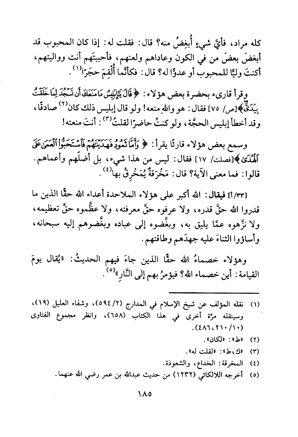 نقله المولف عن شيخ الاسلام في المدارج (594/ 2)، وشفاء العليل (19)،