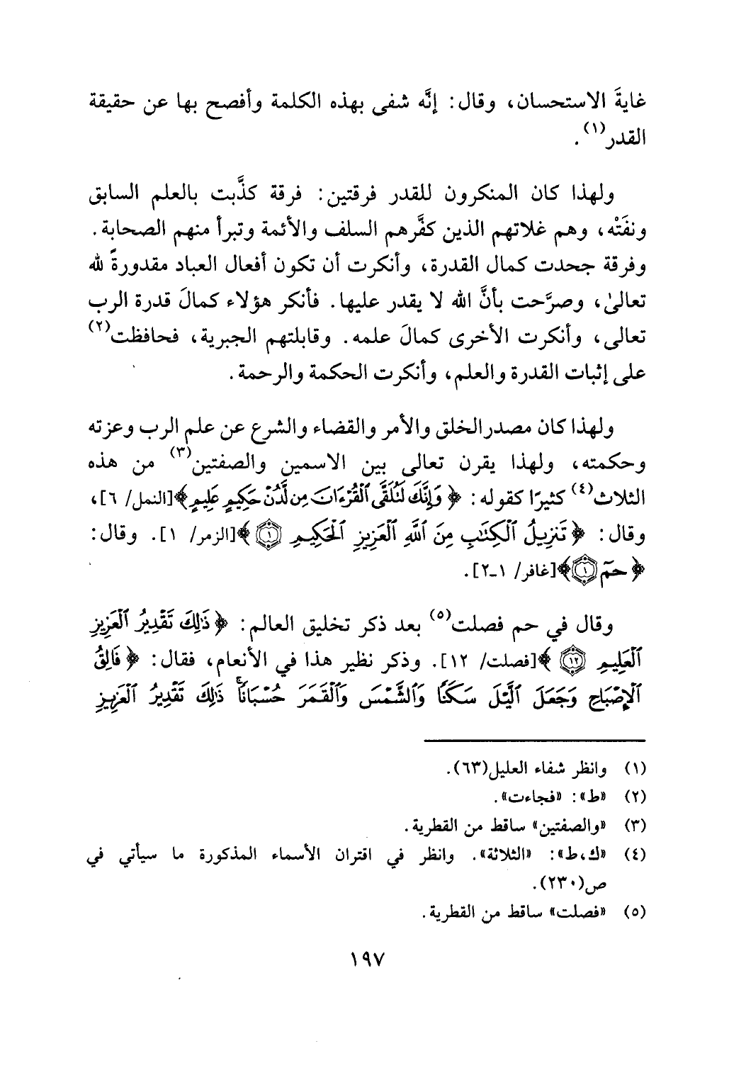 وحكمته، ولهذا يقرن تعالى بين الاسمين والصفتين (3) من هذه