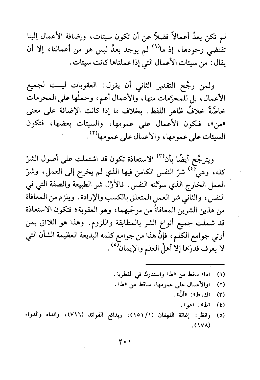 النفس، والثاني شر العمل المتعلق بالكسب والارادة. ويلزم من المعافاة