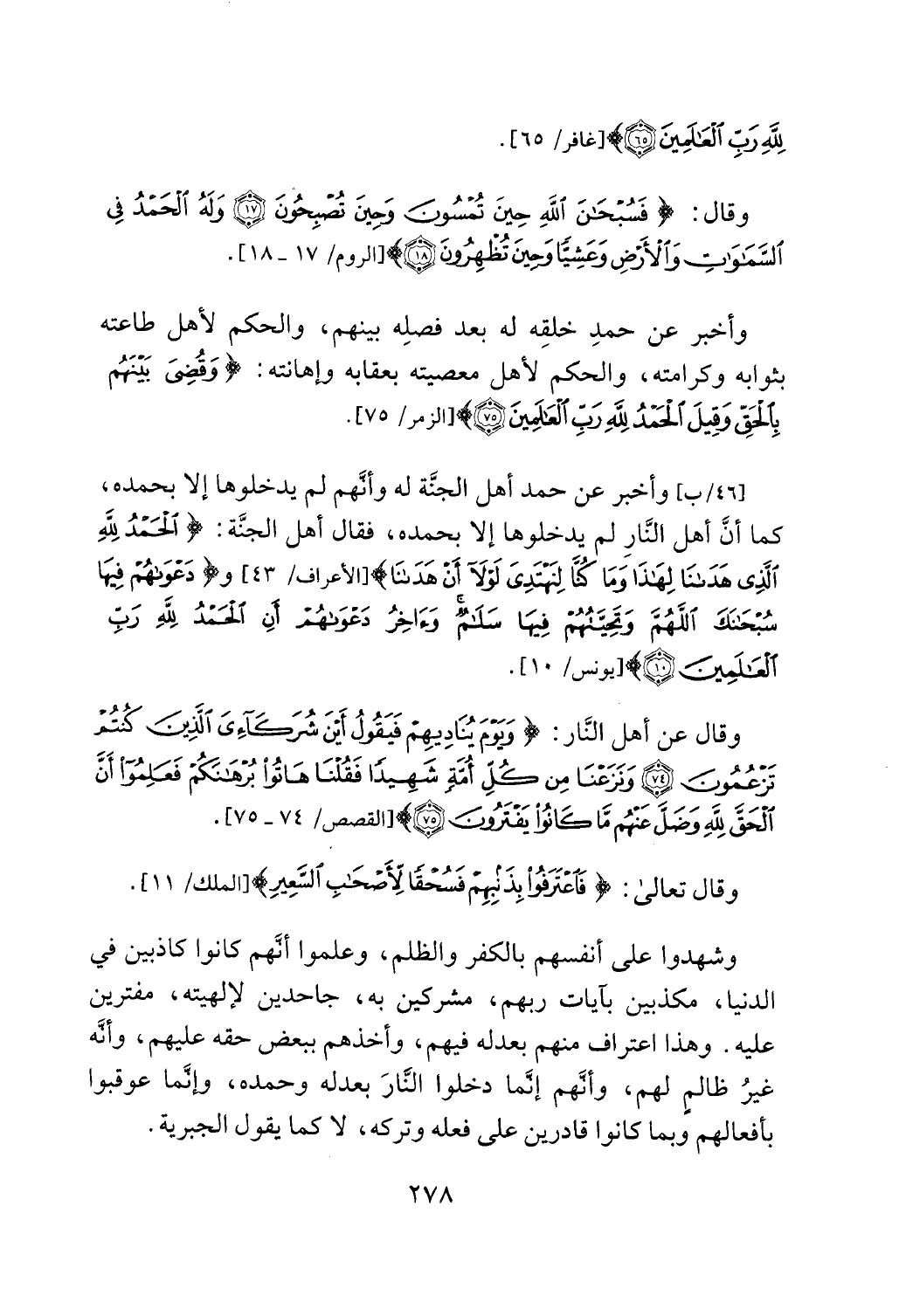 [46/ب] وأخبر عن حمد اهل الجنة له و لهم لم يدخلوها إلا بحمده،