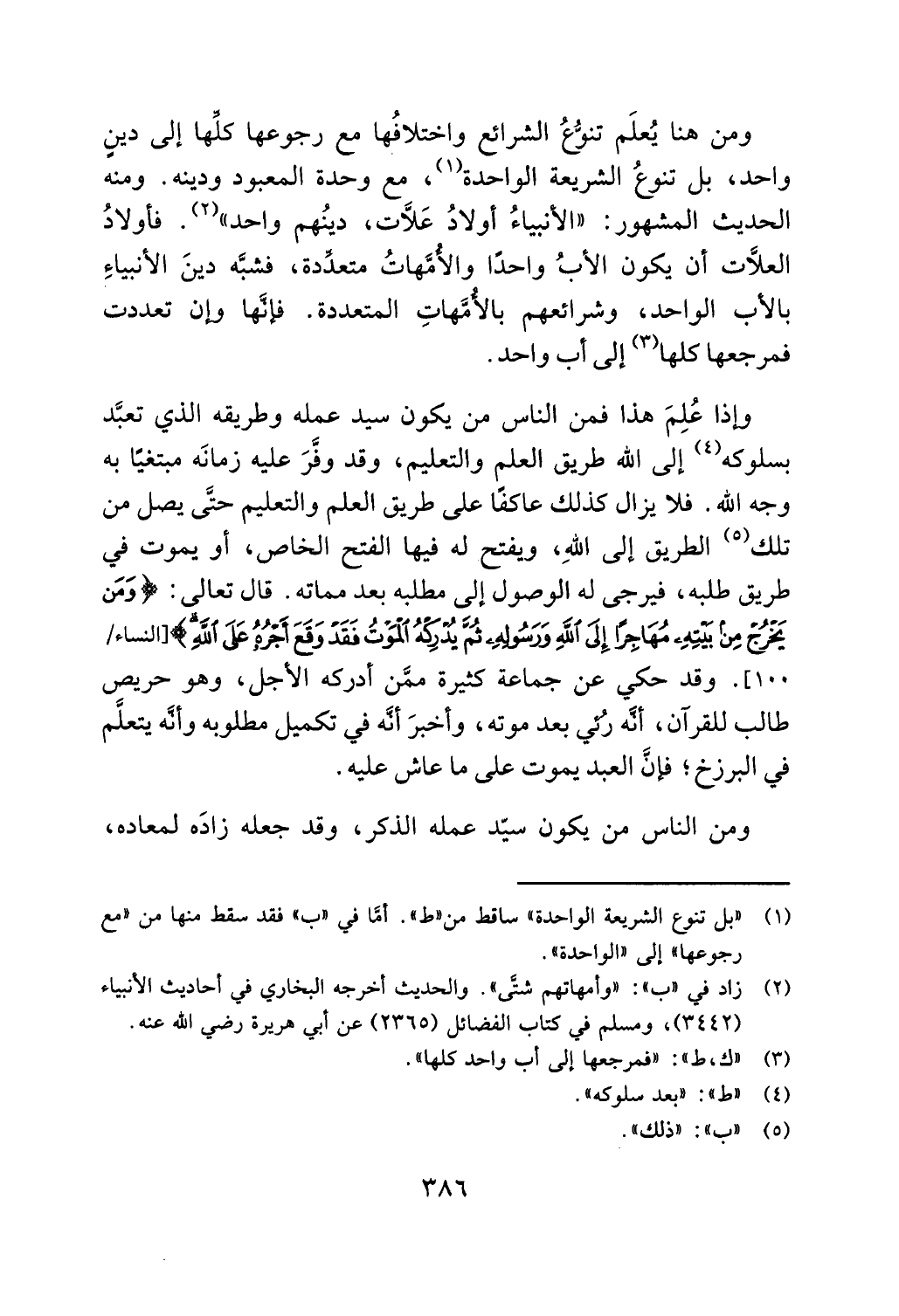 الحديث المشهور: "الأنبياء أولاد علات، دينهم واحد" (2). فاولاد