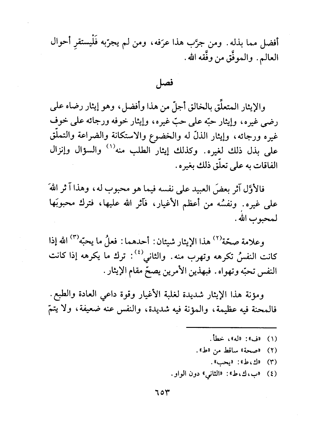 وعلامة صحه هذا الايثار شيئان: أحدهما: فعل ما يحته (3) الله اذا
