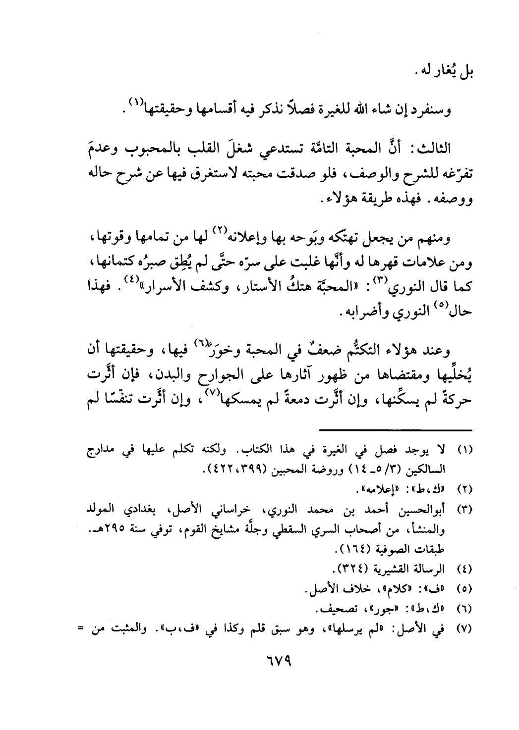 (1) لا يوجد فصل في الغيرة في هذا الكتاب. ولكنه تكلم عليها في مدارج