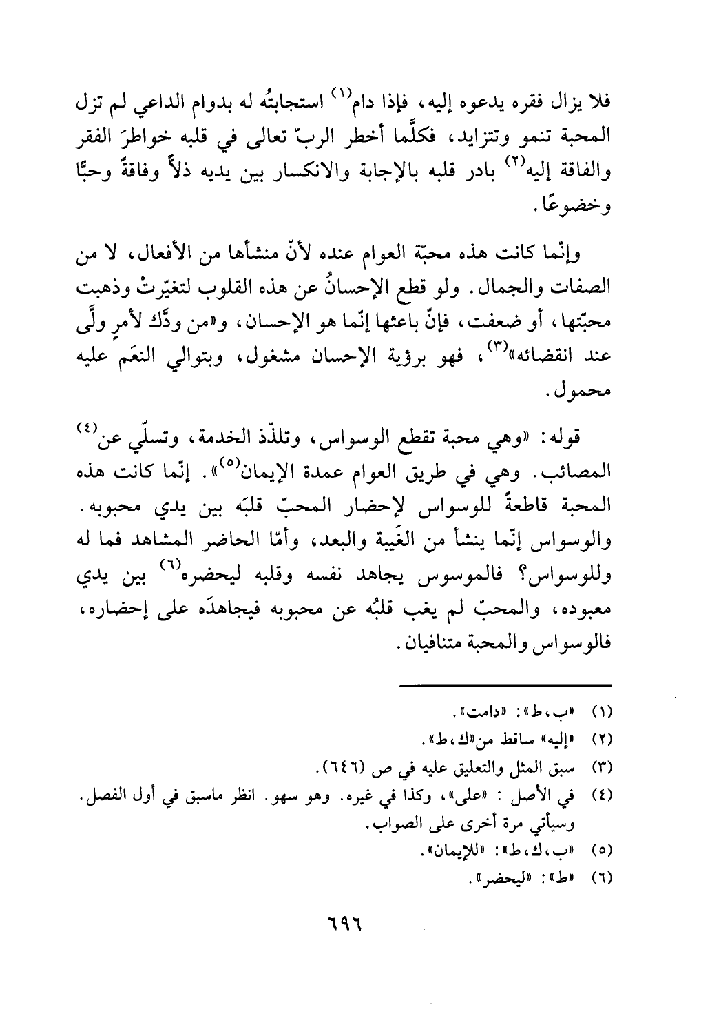 قوله: "وهي محبة تقطع الوسواس، وتلذذ الخدمة، وتسلي عن (4)