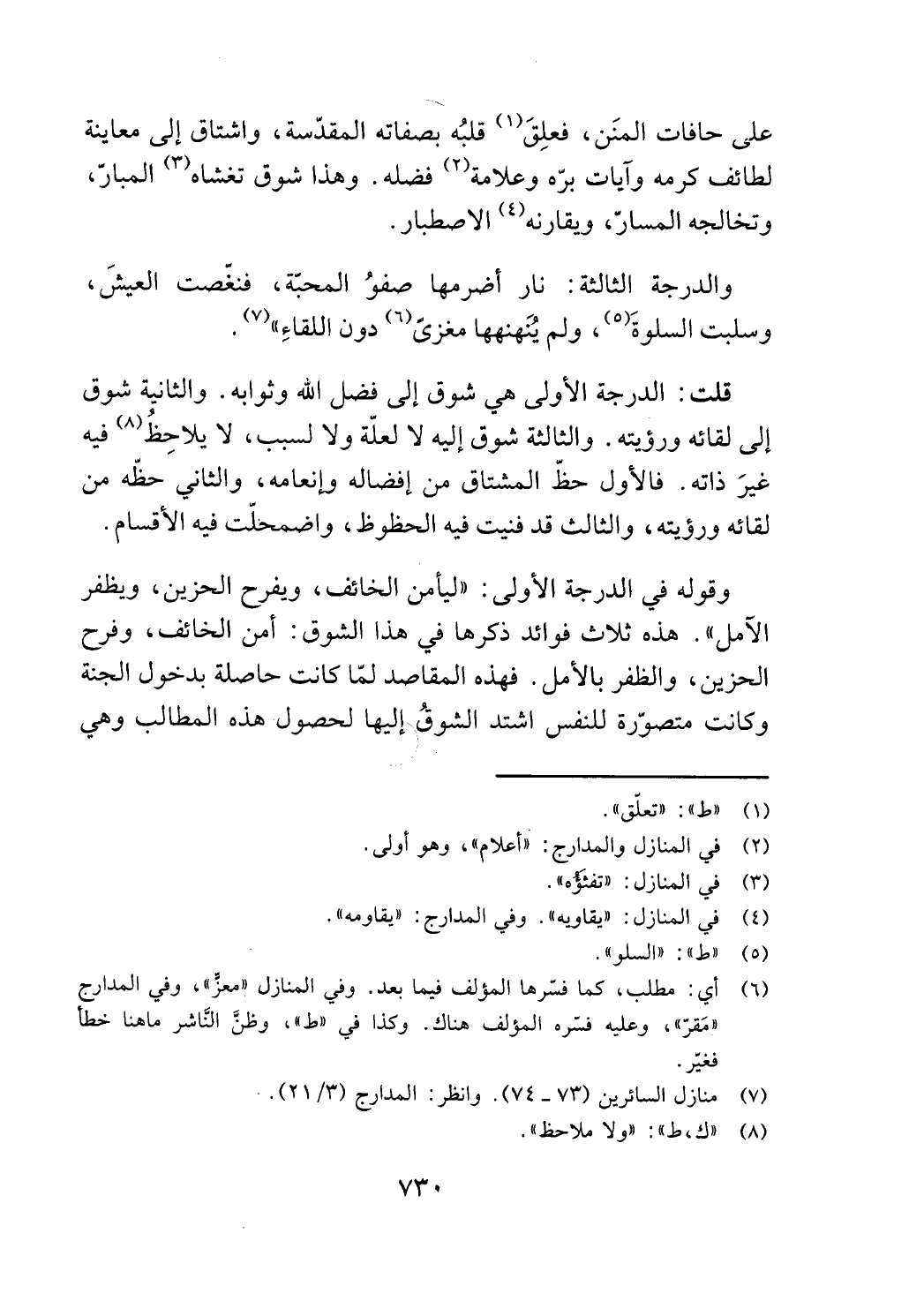 إلى لقائه ورؤيته. والثالثة شوق إليه لا لعلة ولا لسبب، لا يلاحظ (8) فيه