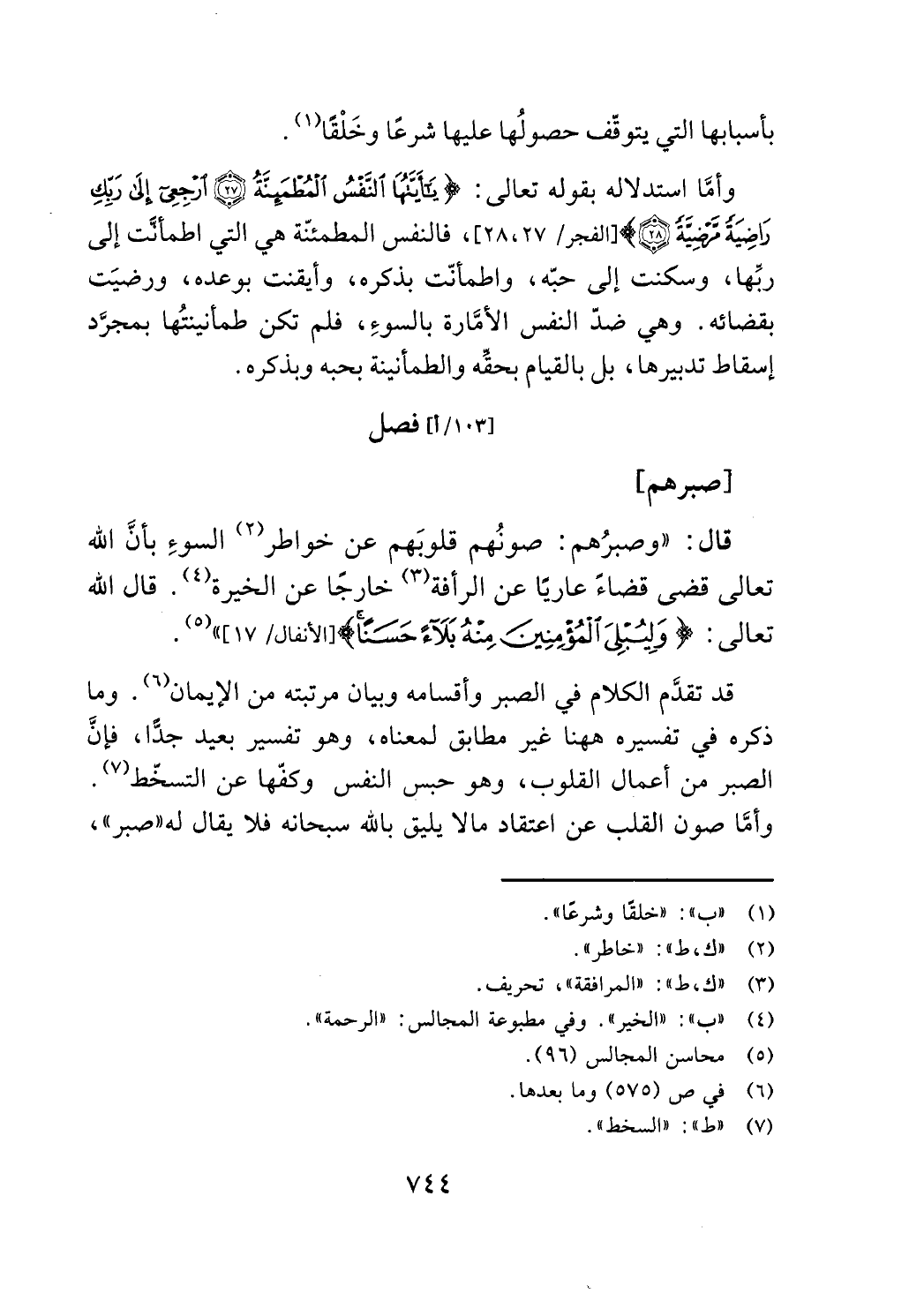 قال: "وصبرهم: صونهم قلوبهم عن خواطر (2) السوء بان الله