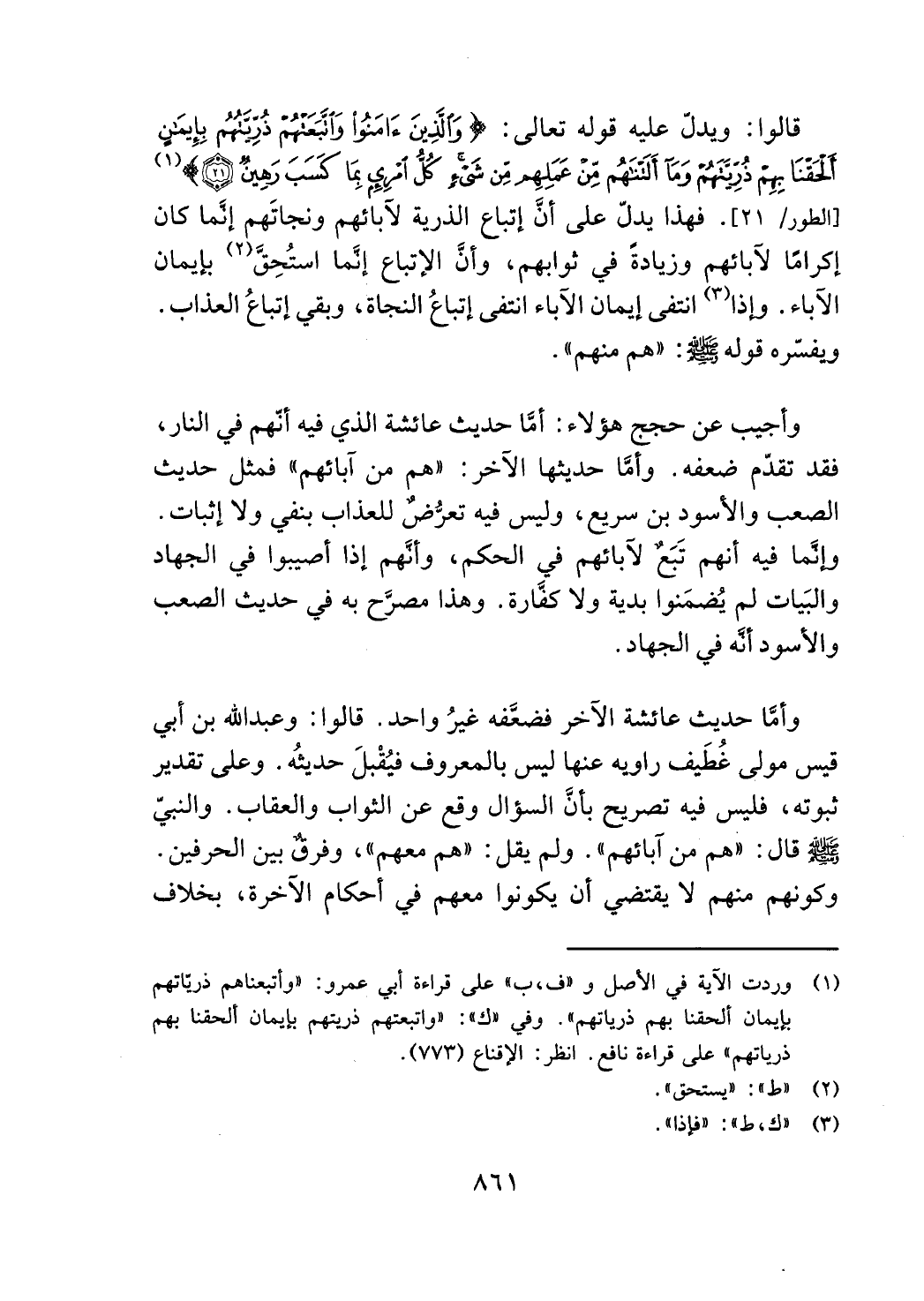 و جيب عن حجح هؤلاء: أما حديث عائشة الذي فيه أنهم في النار،