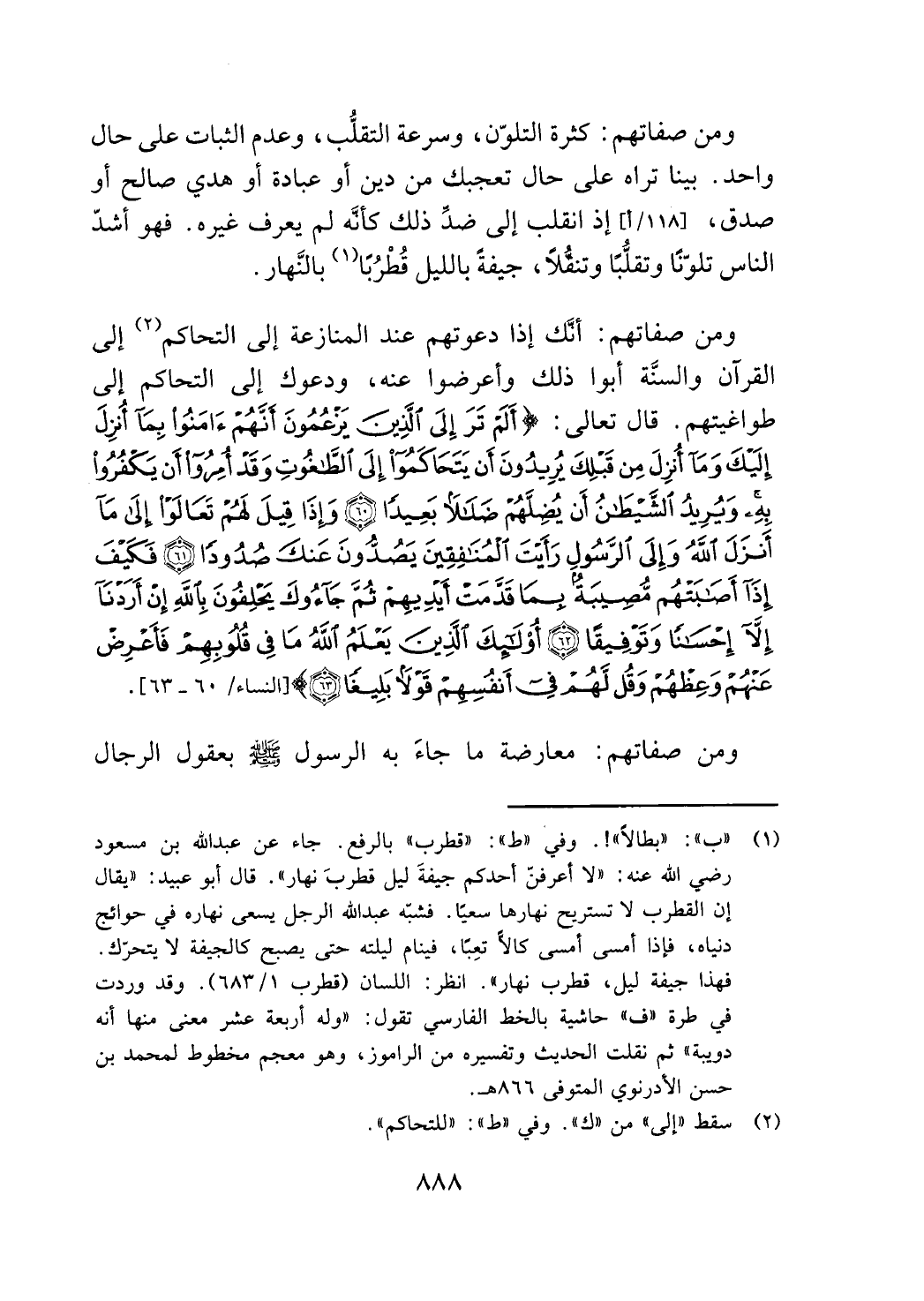 ومن صفاتهم: كثرة التلون، وسرعة التقلب، وعدم الثبات على حال