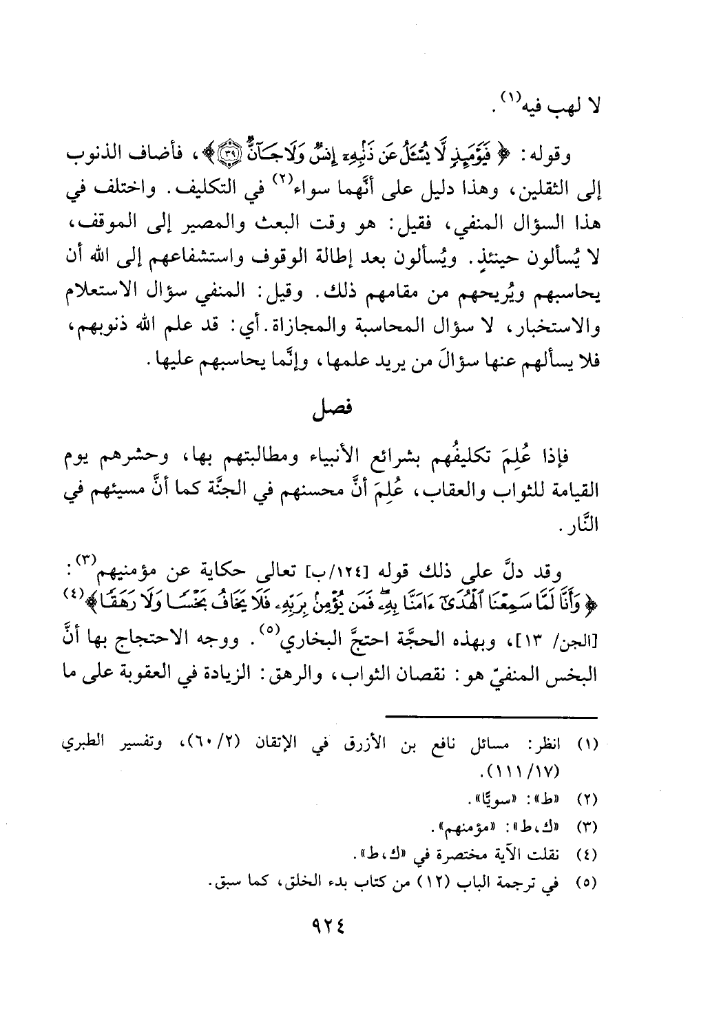 وقوله: < فيؤسد لا يشئل عن ذنبه ء إدنس ولاجان!)، فأضاف الذنوب