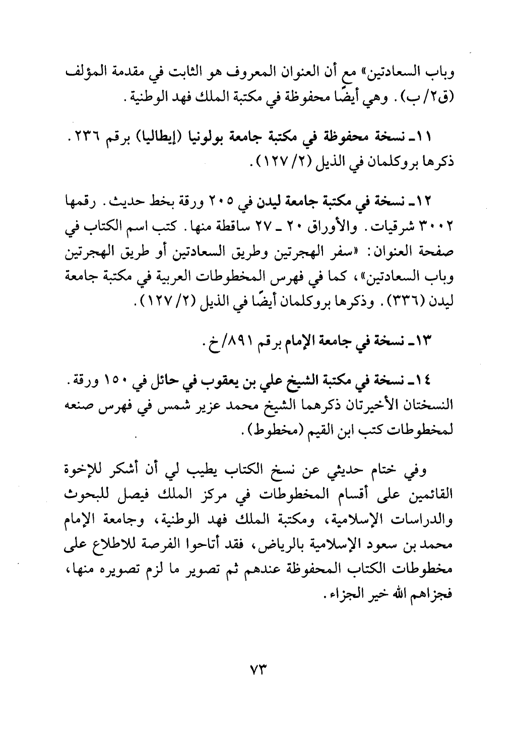 وباب السعادتين " مع أن العنوان المعروف هو الثابت في مقدمة المؤلف