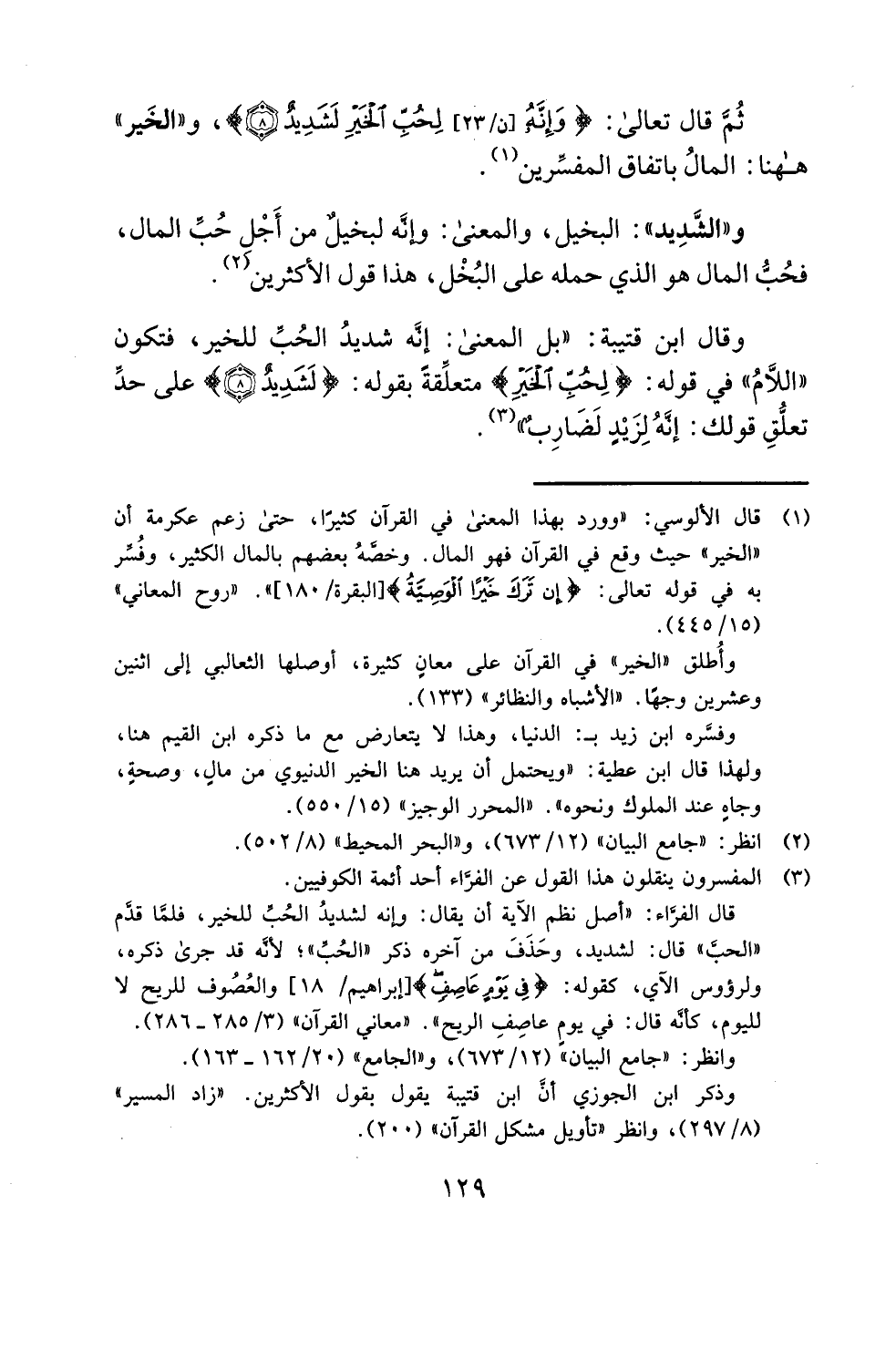 (¬1) قال الألوسي: "وورد بهذا المعنى في القرآن كثيرًا، حتى زعم عكرمة أن "الخير" حيث وقع في القرآن فهو المال. وخصَّهُ بعضهم بالمال الكثير، وفُسِّر به في قوله تعالى: {إِنْ تَرَكَ خَيْرًا الْوَصِيَّةُ} [البقرة: 180] ". "روح المعاني" (15/ 445)