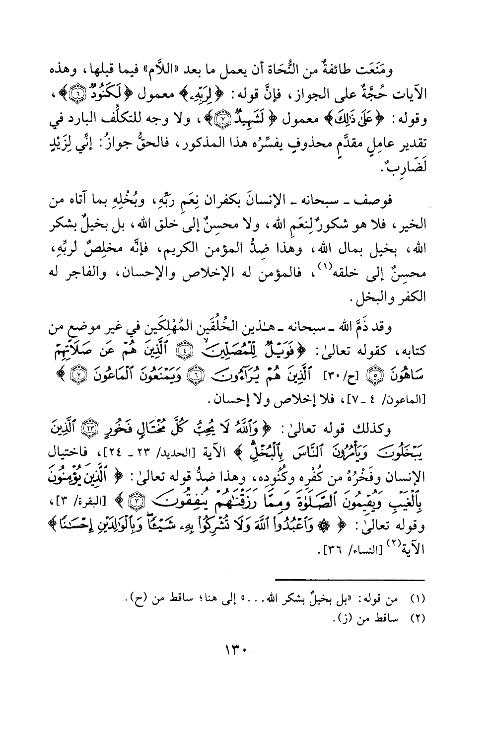 وكذلك قوله تعالى: {وَاللَّهُ لَا يُحِبُّ كُلَّ مُخْتَالٍ فَخُورٍ (23) الَّذِينَ يَبْخَلُونَ وَيَأْمُرُونَ النَّاسَ بِالْبُخْلِ} الآية [الحديد: 23 - 24]، فِاختيال الإنسان وفَخْرُهُ من كُفْره وكُنُودِه، وهذا ضدُّ قوله تعالى: {الَّذِينَ يُؤْمِنُونَ بِالْغَيْبِ وَيُقِيمُونَ الصَّلَاةَ وَمِمَّا رَزَقْنَاهُمْ يُنْفِقُونَ (3)} [البقرة: 3]، وقوله تعالى: {وَاعْبُدُوا اللَّهَ وَلَا تُشْرِكُوا بِهِ شَيْئًا وَبِالْوَالِدَيْنِ إِحْسَانًا} الآية (¬2) [النساء: 36].