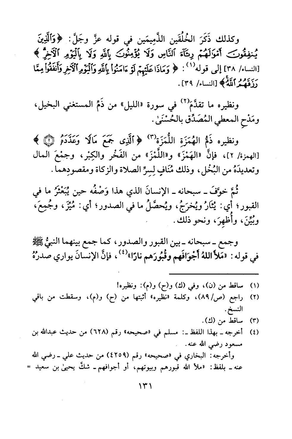 ونظيره ذَمُّ الهُمَزَةِ اللُّمَزَة (¬3) {الَّذِي جَمَعَ مَالًا وَعَدَّدَهُ (2)} [الهمزة: 2]، فإنَّ "الهَمْزَ" و"اللَّمْزَ" من الفَخْر والكِبْر، وجمْعَ المال وتعديدَهُ من البُخْل، وذلك مُنَافٍ لِسِرِّ الصلاة والزكاة ومقصودِهما.