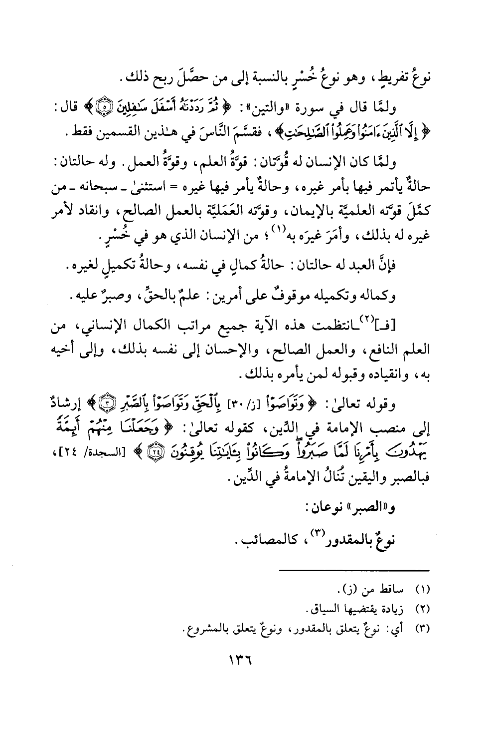 ولمَّا كان الإنسان له قُوَّتان: قوَّةُ العلم، وقوَّةُ العمل. وله حالتان: حالةٌ يأتمر فيها بأمر غيره، وحالةٌ يأمر فيها غيره = استثنى -سبحانه- من كمَّلَ قوَّته العلميَّة بالإيمان، وقوَّته العَمَليَّة بالعمل الصالح، وانقاد لأمر غيره له بذلك، وأمَرَ غيرَه به (¬1)؛ من الإنسان الذي هو في خُسْرٍ.