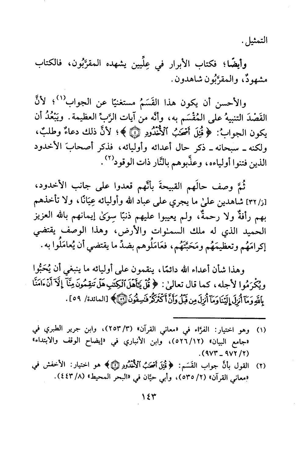 (¬2) القول بأنَّ جواب القَسَم: {قُتِلَ أَصْحَابُ الْأُخْدُودِ (4)} هو اختيار: الأخفش في "معاني القرآن" (2/ 535)، وأبي حيَّان في "البحر المحيط" (8/ 443).