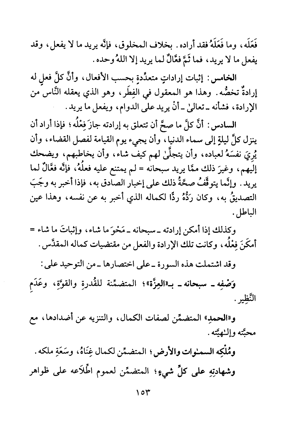 الخامس: إثبات إراداتٍ متعدِّدةٍ بحسب الأفعال، وأنَّ كلَّ فعلٍ له إرادةٌ تخصُّه. وهذا هو المعقول في الفِطَر، وهو الذي يعقله النَّاس من الإرادة، فشأنه -تعالى- أنْ يريد على الدوام، ويفعل ما يريد.