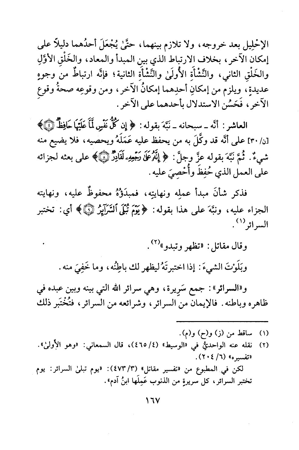 و"السرائر": جمع سَرِيرة، وهي سرائر الله التي بينه وبين عبده في ظاهره وباطنه. فالإيمان من السرائر، وشرائعه من السرائر، فتُخْتَبر ذلك
