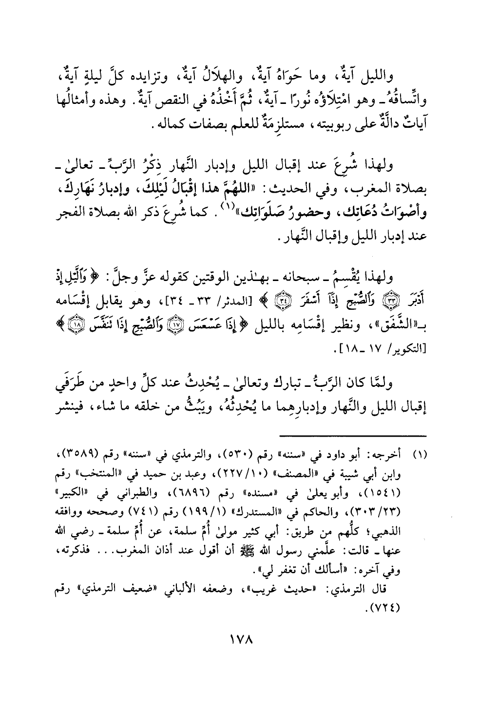 ولهذا شُرِعَ عند إقبال الليل وإدبار النَّهار ذِكْرُ الرَّبِّ -تعالى- بصلاة المغرب، وفي الحديث: "اللهُمَّ هذا إقْبالُ لَيْلِكَ، وإدبارُ نَهَارِكَ، وأصْوَاتُ دُعَاتِك، وحضورُ صَلَوَاتِك" (¬1). كما شُرِعَ ذكر الله بصلاة الفجر عند إدبار الليل وإقبال النَّهار.