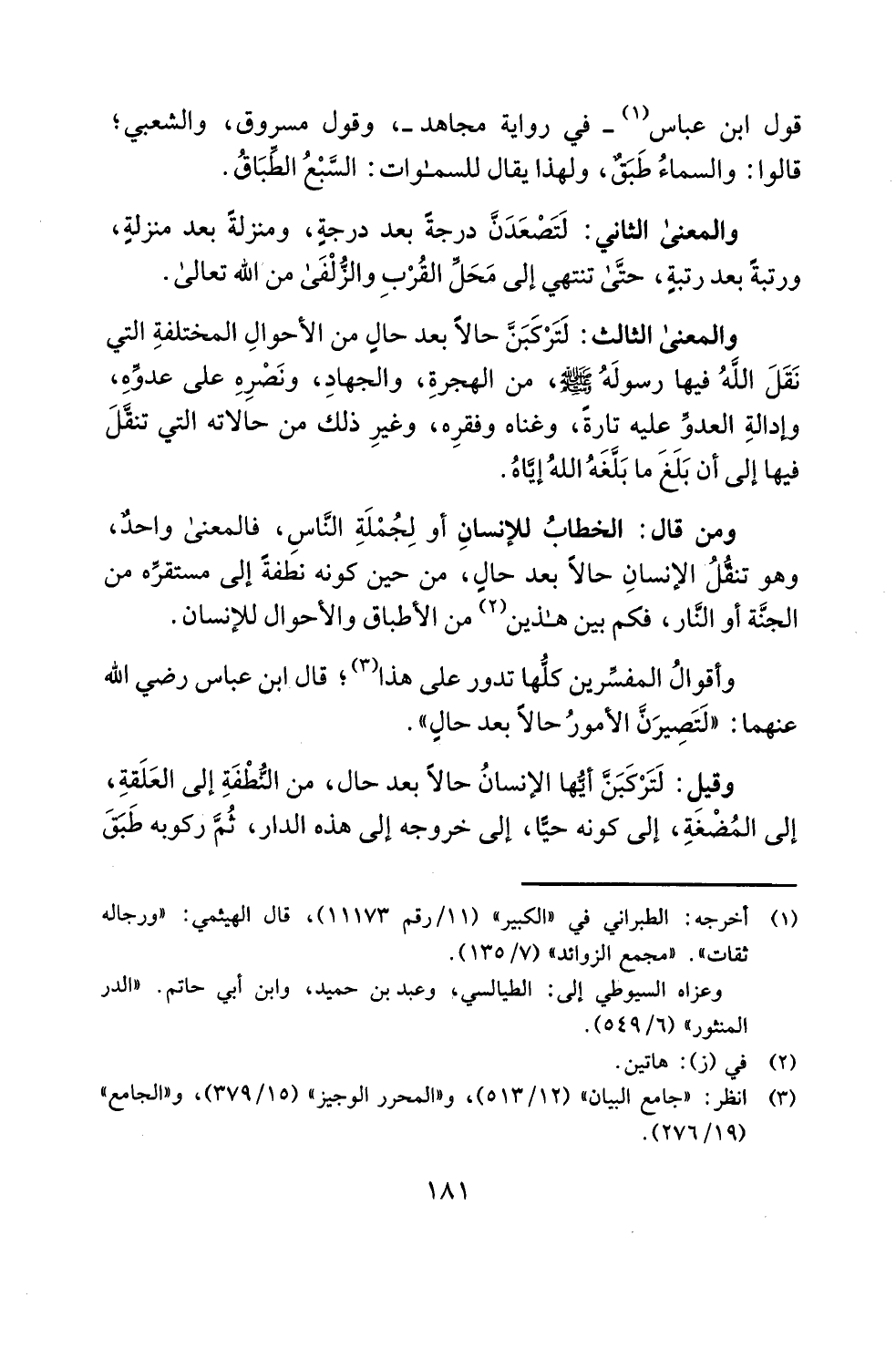 والمعنى الثالث: لَتَرْكَبَنَّ حالاً بعد حالٍ من الأحوالِ المختلفةِ التي نَقَلَ اللهُ فيها رسولَهُ - صلى الله عليه وسلم -، من الهجرةِ، والجهادِ، ونَصْرِهِ على عدوِّهِ، وإدالةِ العدوِّ عليه تارةً، وغناه وفقرِه، وغيرِ ذلك من حالاته التي تنقَّلَ فيها إلى أن بَلَغَ ما بَلَّغَهُ اللهُ إيَّاهُ.