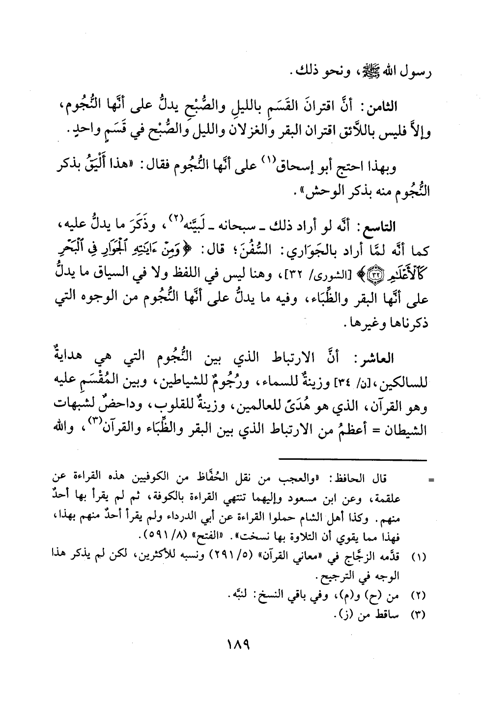 العاشر: أنَّ الارتباط الذي بين النُّجُوم التي هي هدايةٌ للسالكين، وزينةٌ للسماء، ورُجُومٌ للشياطين، وبين المُقْسَمِ عليه وهو القرآن، الذي هو هُدَىً للعالمين، وزينةٌ للقلوب، وداحضٌ لشبهات الشيطان = أعظمُ من الارتباط الذي بين البقر والظِّبَاء والقرآن (¬3)، والله