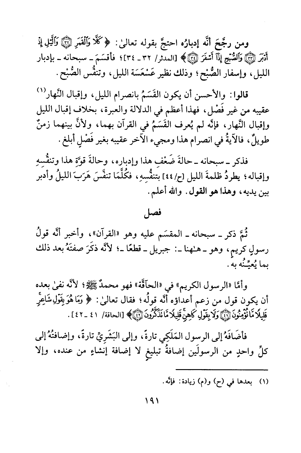 قالوا: والأحسن أن يكون القَسَمُ بانصرام الليل، وإقبال النَّهار (¬1) عقيبه من غير فَصْل، فهذا أعظم في الدلالة والعبرة، بخلاف إقبال الليل وإقبال النَّهار، فإنَّه لم يُعرف القَسَمُ في القرآن بهما، ولأنَّ بينهما زمنٌ طويلٌ، فالآيةُ في انصرام هذا ومجيء الآخر عقيبه بغير فَصْلٍ أبلغ.