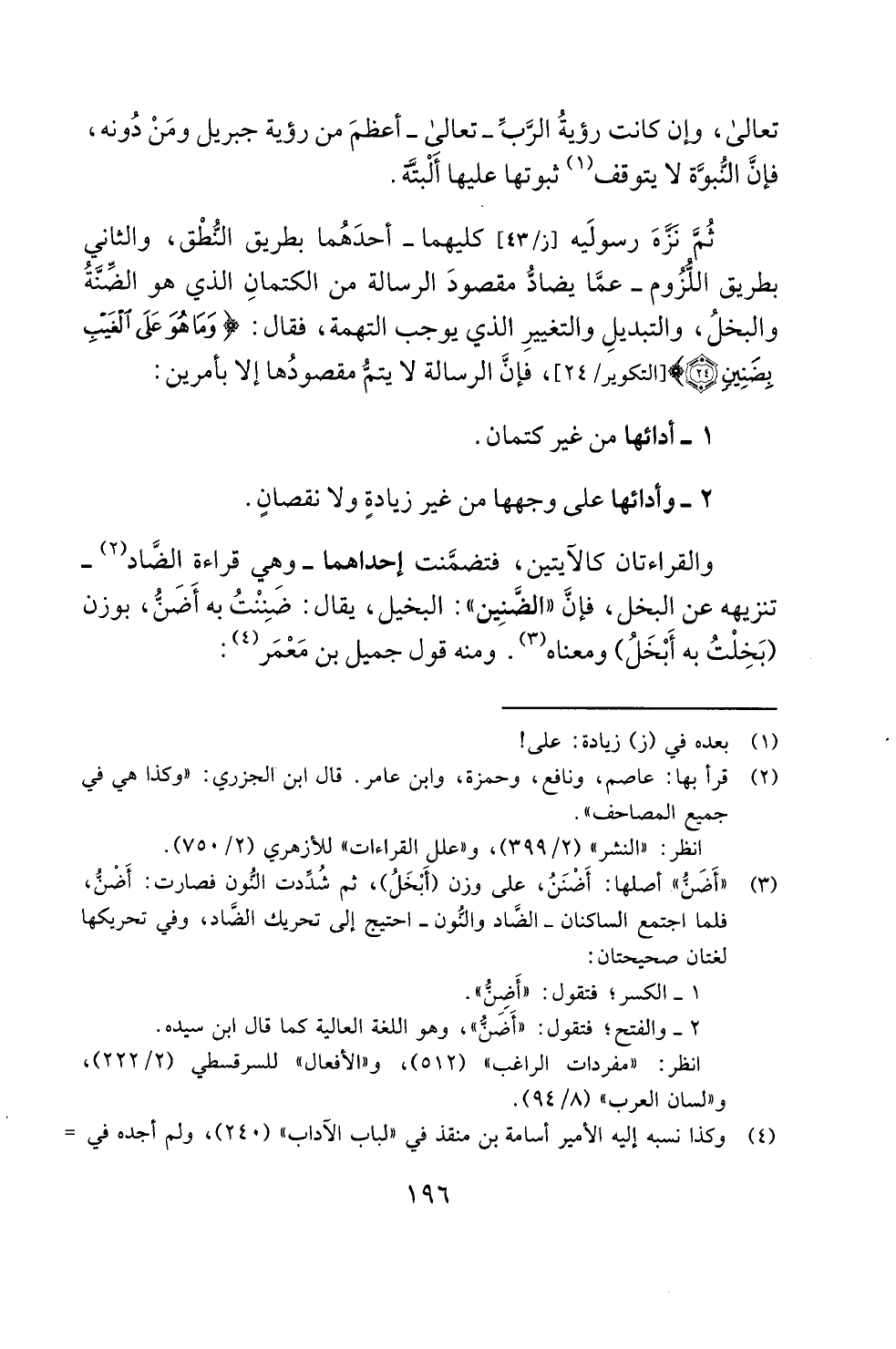 والقراءتان كالآيتين، فتضمَّنت إحداهما -وهي قراءة الضَّاد (¬2) - تنزيهه عن البخل، فإنَّ "الضَّنِين": البخيل، يقال: ضَنِنْتُ به أَضَنُّ، بوزن (بَخِلْتُ به أَبْخَلُ) ومعناه (¬3). ومنه قول جميل بن مَعْمَر (¬4):