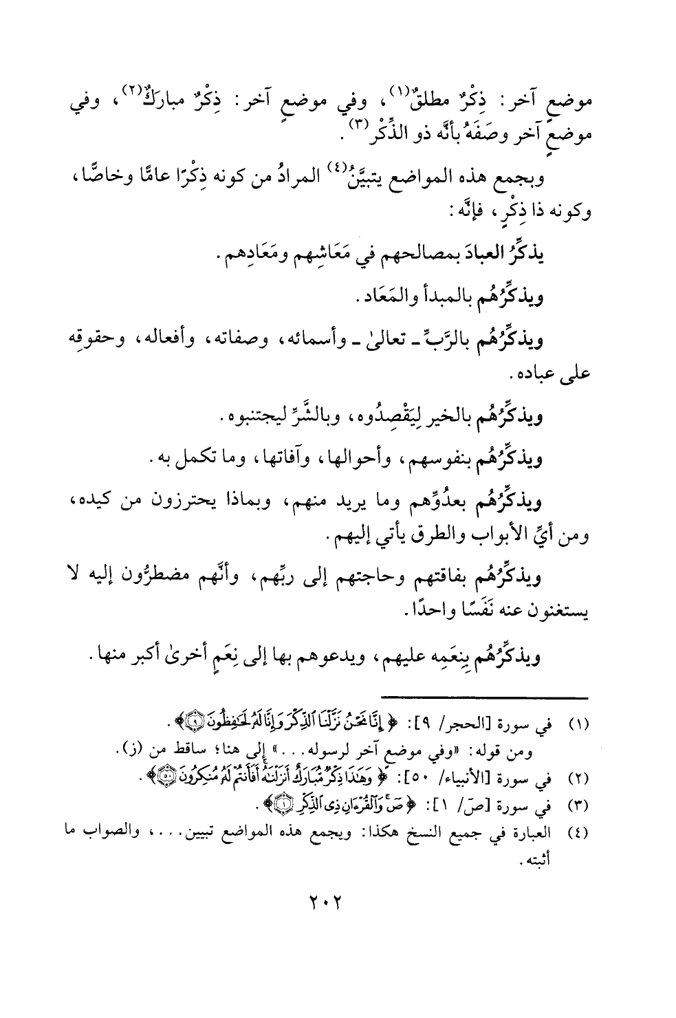 موضعٍ آخر: ذِكْرٌ مطلقٌ (¬1)، وفي موضعٍ آخر: ذِكْرٌ مبارَكٌ (¬2)، وفي موضعٍ آخر وصَفَهُ بأنَّه ذو الذِّكْر (¬3).