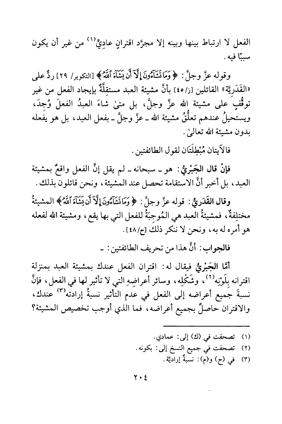 وقوله -عزَّ وجلَّ-: {وَمَا تَشَاءُونَ إِلَّا أَنْ يَشَاءَ اللَّهُ} [التكوير: 29] ردٌّ على "القَدَرِيَّة" القائلين بأنَّ مشيئة العبد مستقِلَّةٌ بإيجاد الفعل من غير توقُّفٍ على مشيئة الله -عزَّ وجلَّ-، بل متى شاءَ العبدُ الفعلَ وُجِدَ، ويستحيلُ عندهم تعلُّقُ مشيئة الله -عزَّ وجلَّ- بفعل العبد، بل هو يفعله بدون مشيئة الله تعالى.