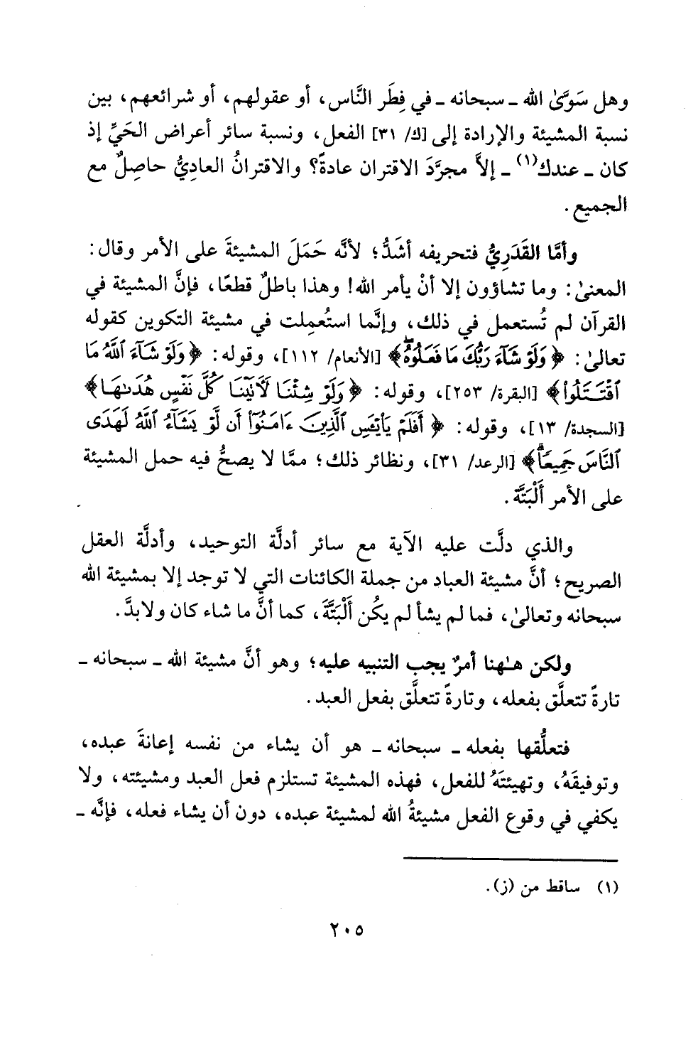 وأمَّا القَدَرِىُّ فتحريفه أشَدُّ؛ لأنَّه حَمَلَ المشيئةَ على الأمر وقال: المعنى: وما تشاؤون إلا أنْ يأمر الله! وهذا باطلٌ قطعًا، فإنَّ المشيئة في القرآن لم تُستعمل في ذلك, وإنَّما استُعمِلت في مشيئة التكوين كقوله تعالى: {وَلَوْ شَاءَ رَبُّكَ مَا فَعَلُوهُ} [الأنعام: 112]، وقوله: {وَلَوْ شَاءَ اللَّهُ مَا اقْتَتَلُوا} [البقرة: 253]، وقوله: {وَلَوْ شِئْنَا لَآتَيْنَا كُلَّ نَفْسٍ هُدَاهَا} [السجدة: 13]، وقوله: {أَفَلَمْ يَيْأَسِ الَّذِينَ آمَنُوا أَنْ لَوْ يَشَاءُ اللَّهُ لَهَدَى النَّاسَ جَمِيعًا} [الرعد: 31]، ونظائر ذلك؛ ممَّا لا يصحُّ فيه حمل المشيئة على الأمر أَلْبَتَّة.