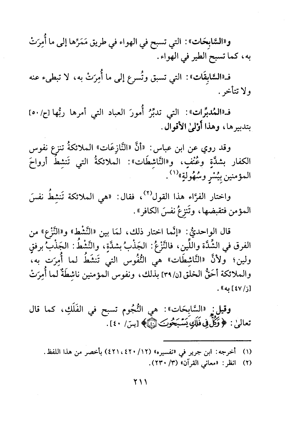 وقد روي عن ابن عباس: "أنَّ "النَّازِعَات" الملائكةُ تنزع نفوس الكفار بشدَّةٍ وعُنْفٍ، و"النَّاشِطَات": الملائكةُ التي تَنشِطُ أرواحَ المؤمنين بِيُسْرٍ وسُهُولةٍ" (¬1).