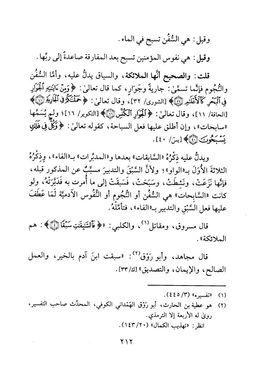 قلت: والصحيح أنَّها الملائكة، والسياق يدلُّ عليه، وأمَّا السُّفُن والنُّجُوم فإنَّما تسمَّى: جاريةً وجَوَارٍ، كما قال تعالى: {وَمِنْ آيَاتِهِ الْجَوَارِ فِي الْبَحْرِ كَالْأَعْلَامِ (32)} [الشورى: 32]، وقال تعالى: {حَمَلْنَاكُمْ فِي الْجَارِيَةِ (11)} [الحاقة: 11]، وقال تعالى: {الْجَوَارِ الْكُنَّسِ (16)} [التكوير: 16]؛ ولم يُسَمِّها "سابحات"، وإن أطلق عليها فعل السباحة، كقوله تعالى: {وَكُلٌّ فِي فَلَكٍ يَسْبَحُونَ (40)} [يس: 40].