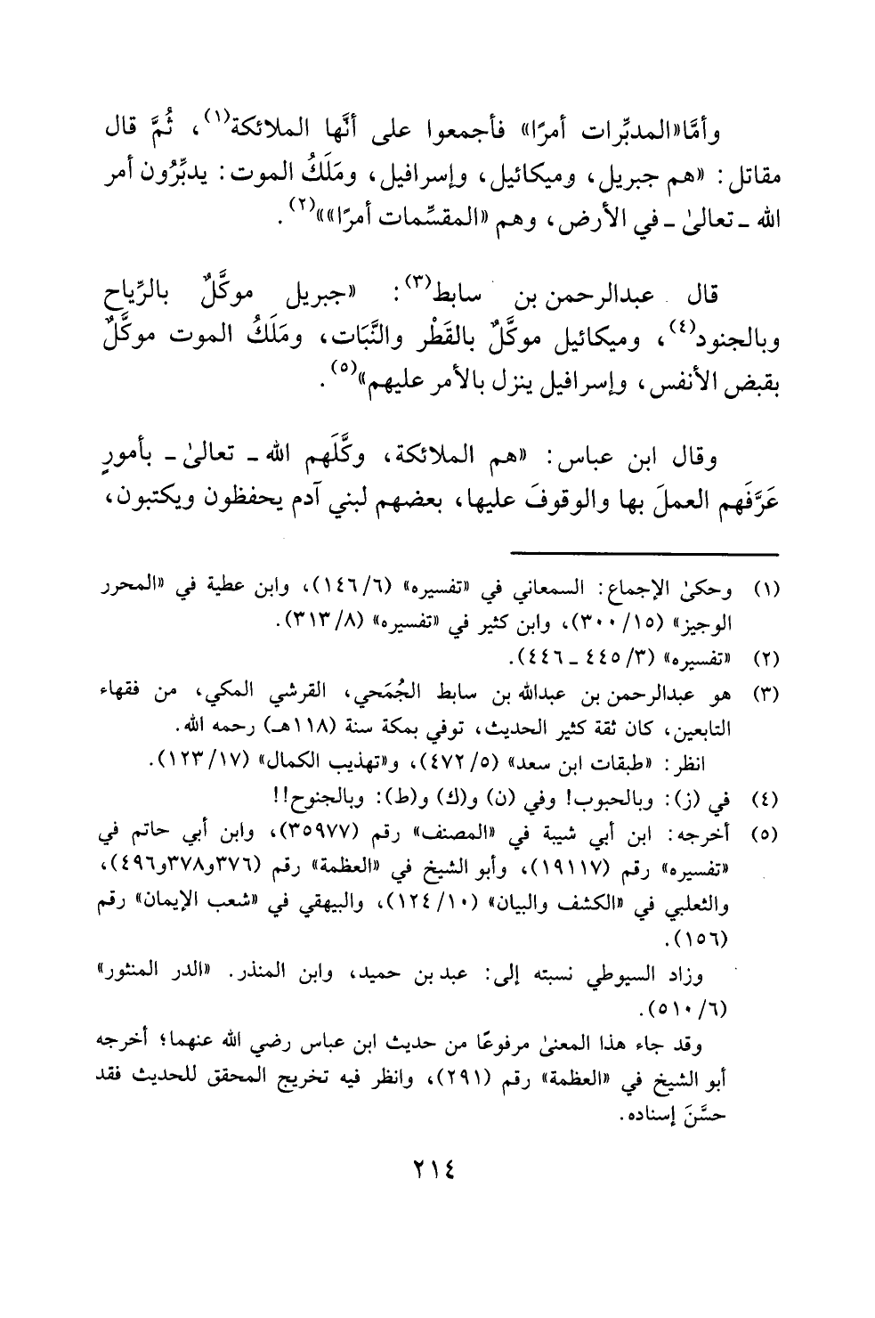قال عبد الرحمن بن سابط (¬3): "جبريل موكَّلٌ بالرِّياح وبالجنود (¬4)، وميكائيل موكَّلٌ بالقَطْر والنَّبَات، ومَلَكُ الموت موكَّلٌ بقبض الأنفس، وإسرافيل ينزل بالأمر عليهم" (¬5).