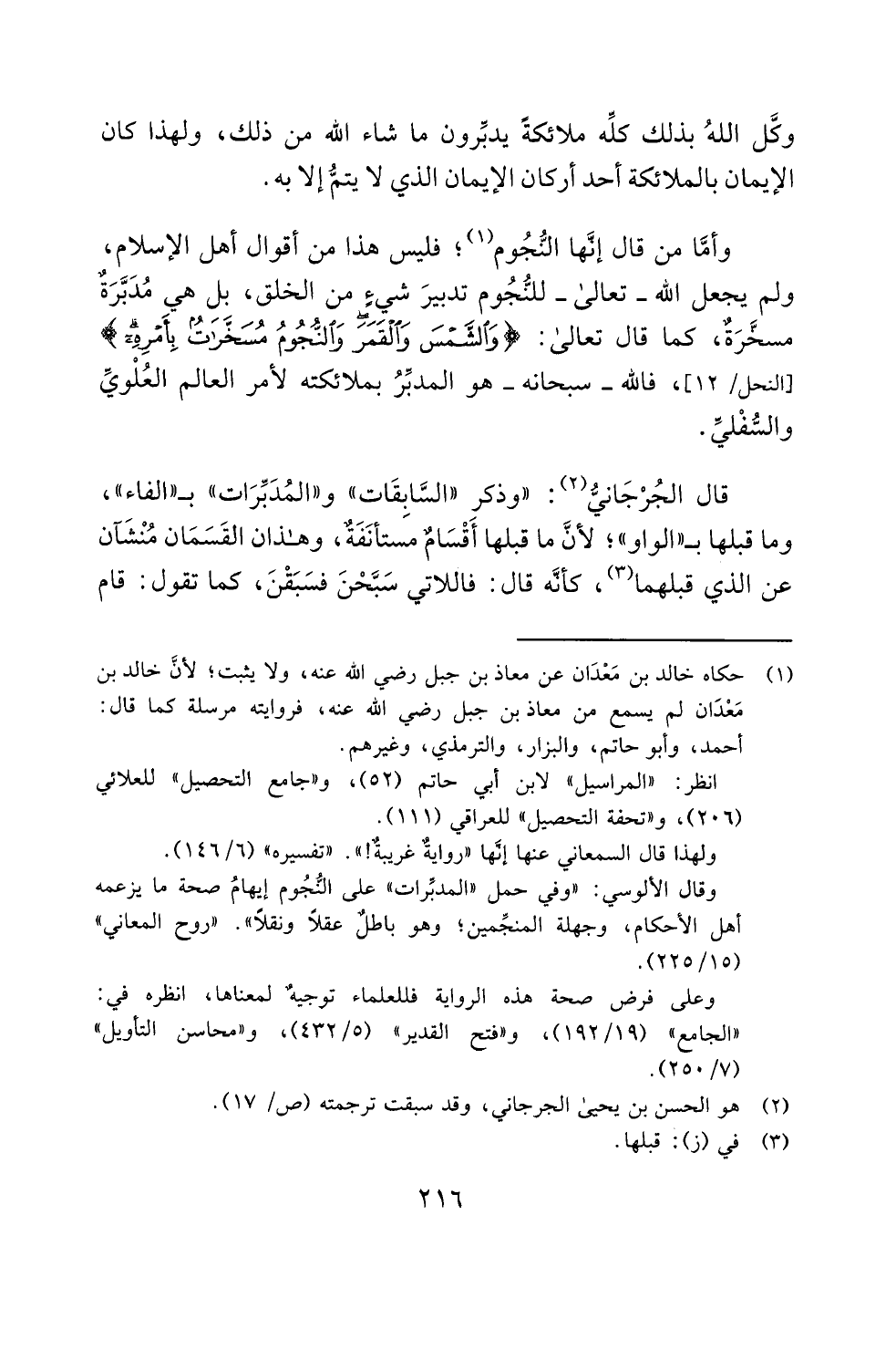 وأمَّا من قال إنَّها النُّجُوم (¬1)؛ فليس هذا من أقوال أهل الإسلام، ولم يجعل الله -تعالى- للنُّجُوم تدبيرَ شيءٍ من الخلق، بل هي مُدَبَّرَةٌ مسخَّرَةٌ، كما قال تعالى: {وَالشَّمْسَ وَالْقَمَرَ وَالنُّجُومُ مُسَخَّرَاتٌ بِأَمْرِهِ} [النحل: 12]، فالله -سبحانه- هو المدبِّرُ بملائكته لأمر العالم العُلْويِّ والسُّفْليِّ.