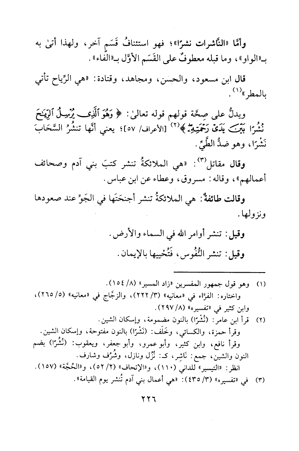 ويدلُّ على صِحَّة قولهم قوله تعالى: {وَهُوَ الَّذِي يُرْسِلُ الرِّيَاحَ بُشْرًا بَيْنَ يَدَيْ رَحْمَتِهِ} (¬2) [الأعراف: 57]؛ يعني أنَّها تنشُرُ السَّحَابَ نَشْرًا، وهو ضدُّ الطَّيِّ.