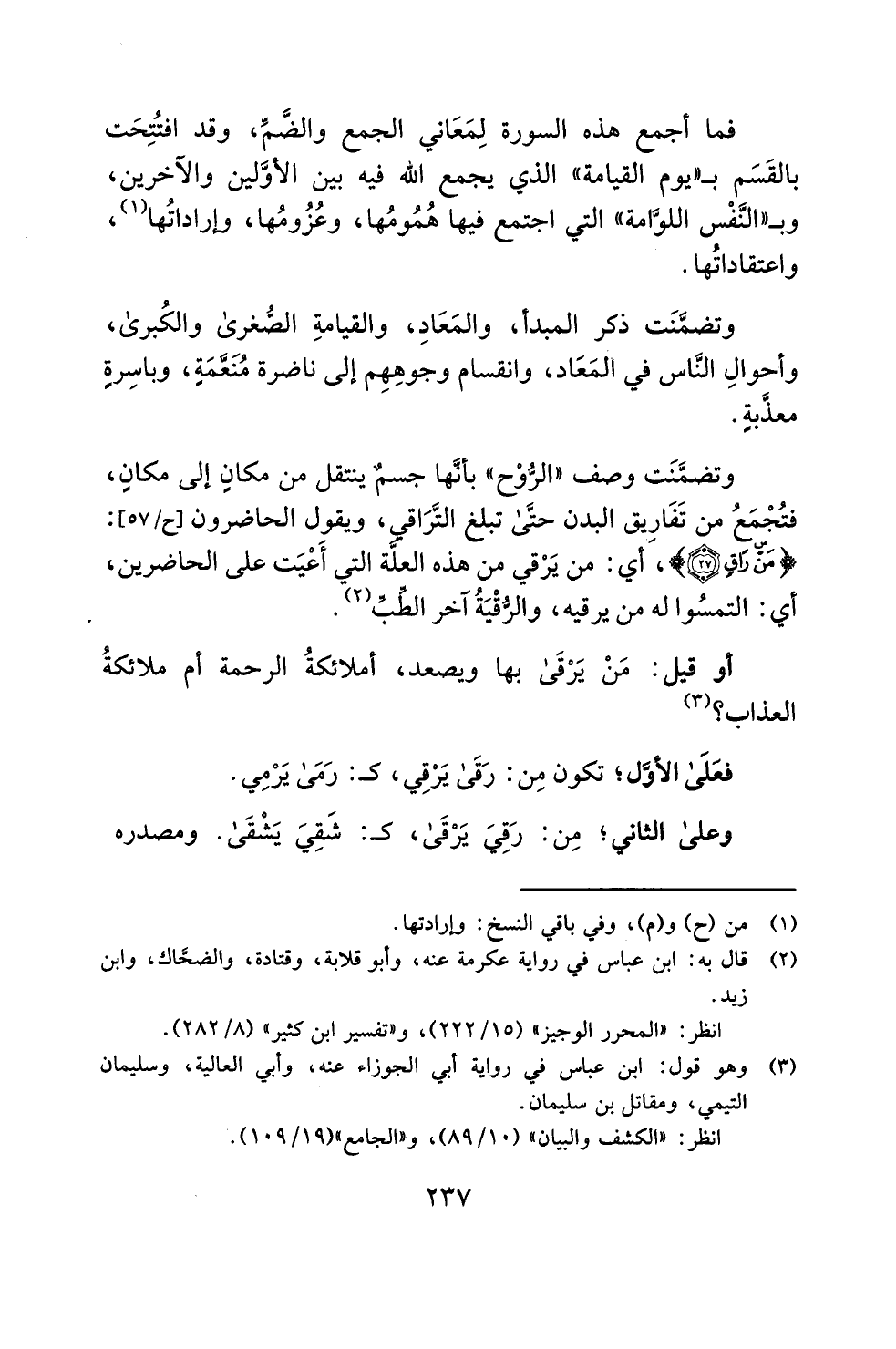 وتضمَّنَت وصف "الرُّوْح" بأنَّها جسمٌ ينتقل من مكانٍ إلى مكانٍ، فتُجْمَعُ من تَفَاريق البدن حئى تبلغ التَّرَاقي، ويقول الحاضرون: {مَنْ رَاقٍ (27)} , أي: من يَرْقي من هذه العلّة التي أَعْيَت على الحاضرين، أي: التمسُوا له من يرقيه، والرُّقْيَةُ آخر الطِّبِّ (¬2).