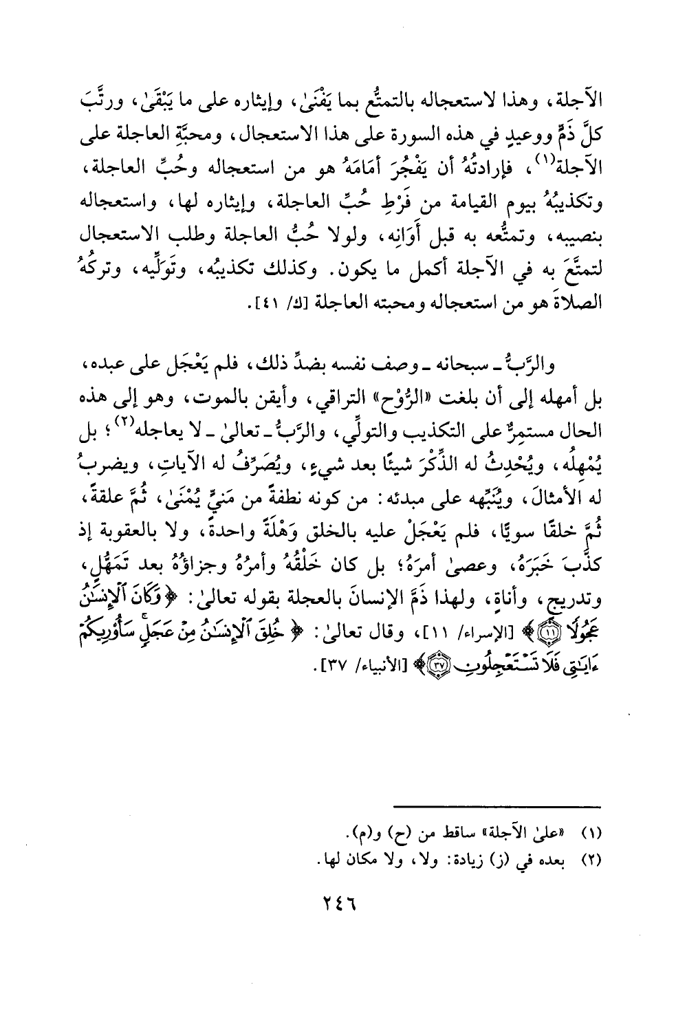 والرَّبُّ -سبحانه- وصف نفسه بضدِّ ذلك، فلم يَعْجَل على عبده، بل أمهله إلى أن بلغت "الرُّوْح" التراقي، وأيقن بالموت، وهو إلى هذه الحال مستمِرٌّ على التكذيب والتولِّي، والرَّبُّ -تعالى- لا يعاجله (¬2)؛ بل يُمْهِلُه، ويُحْدِثُ له الذِّكْرَ شيئًا بعد شيءٍ، ويُصَرِّفُ له الآياتِ، ويضربُ له الأمثالَ، ويُنَبِّهه على مبدئه: من كونه نطفةً من مَنيٍّ يُمْنَى، ثُمَّ علقةً، ثُمَّ خلقًا سويًّا، فلم يَعْجَلْ عليه بالخلق وَهْلَةً واحدةً، ولا بالعقوبة إذ كذَّبَ خَبَرَهُ، وعصى أمرَهُ؛ بل كان خَلْقُهُ وأمرُهُ وجزاؤُهُ بعد تَمَهُّلٍ، وتدريجٍ، وأناةٍ، ولهذا ذَمَّ الإنسانَ بالعجلة بقوله تعالى: {وَكَانَ الْإِنْسَانُ عَجُولًا (11)} [الإسراء: 11]، وقال تعالى: {خُلِقَ الْإِنْسَانُ مِنْ عَجَلٍ سَأُرِيكُمْ آيَاتِي فَلَا تَسْتَعْجِلُونِ (37)} [الأنبياء: 37].