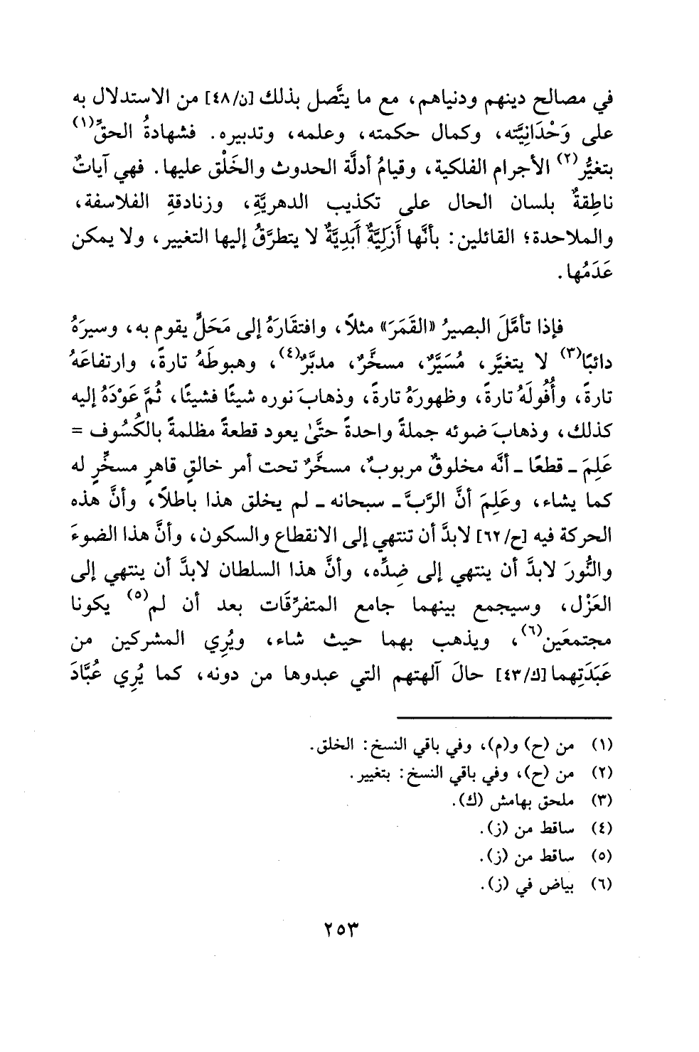 في مصالح دينهم ودنياهم، مع ما يتَّصل بذلك من الاستدلال به على وَحْدَانِيَّته، وكمال حكمته، وعلمه، وتدبيره. فشهادةُ الحق (¬1) بتغيُّر (¬2) الأجرام الفلكية، وقيامُ أدلَّة الحدوث والخَلْق عليها. فهي آياتٌ ناطِقةٌ بلسان الحال على تكذيب الدهريَّةِ، وزنادقةِ الفلاسفة، والملاحدة؛ القائلين: بأنَّها أَزليَّةٌ أبَدِيَّةٌ لا يتطرَّقُ إليها التغيير، ولا يمكن عَدَمُها.