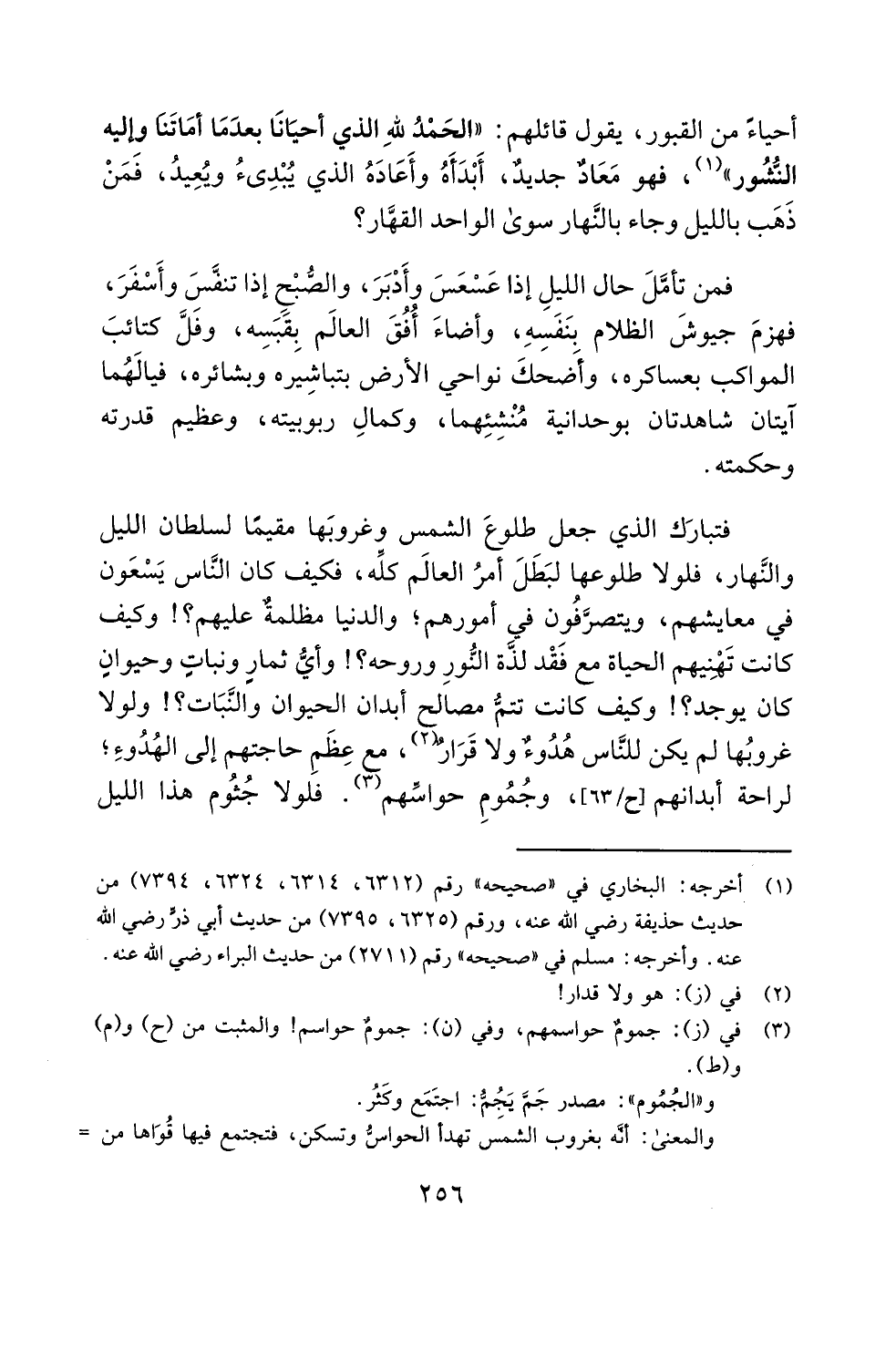 فمن تأمَّلَ حال الليلِ إذا عَسْعَسَ وأَدْبَرَ، والصُّبْحِ إذا تنفَّسَ وأَسْفَرَ، فهزمَ جيوشَ الظلام بنَفَسِهِ، وأضاءَ أُفُقَ العالَم بِقَبَسِه، وفَلَّ كتائبَ المواكب بعساكره، وأضحكَ نواحي الأرض بتباشِيره وبشائره، فيالَهُما آيتان شاهدتان بوحدانية مُنْشِئِهما، وكمالِ ربوبيته، وعظيم قدرته وحكمته.