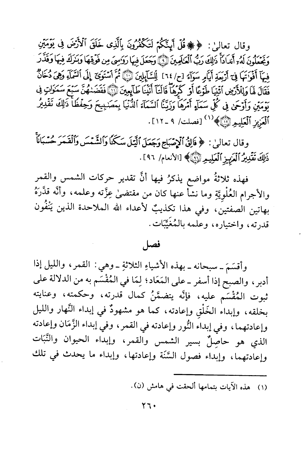 وقال تعالى: {قُلْ أَئِنَّكُمْ لَتَكْفُرُونَ بِالَّذِي خَلَقَ الْأَرْضَ فِي يَوْمَيْنِ وَتَجْعَلُونَ لَهُ أَنْدَادًا ذَلِكَ رَبُّ الْعَالَمِينَ (9) وَجَعَلَ فِيهَا رَوَاسِيَ مِنْ فَوْقِهَا وَبَارَكَ فِيهَا وَقَدَّرَ فِيهَا أَقْوَاتَهَا فِي أَرْبَعَةِ أَيَّامٍ سَوَاءً لِلسَّائِلِينَ (10) ثُمَّ اسْتَوَى إِلَى السَّمَاءِ وَهِيَ دُخَانٌ فَقَالَ لَهَا وَلِلْأَرْضِ ائْتِيَا طَوْعًا أَوْ كَرْهًا قَالَتَا أَتَيْنَا طَائِعِينَ (11) فَقَضَاهُنَّ سَبْعَ سَمَاوَاتٍ فِي يَوْمَيْنِ وَأَوْحَى فِي كُلِّ سَمَاءٍ أَمْرَهَا وَزَيَّنَّا السَّمَاءَ الدُّنْيَا بِمَصَابِيحَ وَحِفْظًا ذَلِكَ تَقْدِيرُ الْعَزِيزِ الْعَلِيمِ (12)} (¬1) [فصلت: 9 - 12].