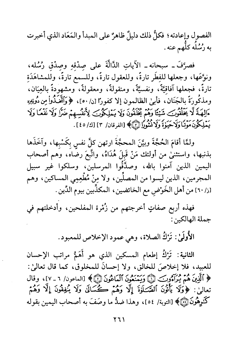 الثانية: تَرْكُ إطعام المسكين الذي هو أَهَمُّ مراتب الإحسان للعبيد، فلا إخلاصَ للخالق، ولا إحسانَ للمخلوق، كما قال تعالى: {الَّذِينَ هُمْ يُرَاءُونَ (6) وَيَمْنَعُونَ الْمَاعُونَ (7)} [الماعون: 6 - 7]، وقال تعالى: {وَلَا يَأْتُونَ الصَّلَاةَ إِلَّا وَهُمْ كُسَالَى وَلَا يُنْفِقُونَ إِلَّا وَهُمْ كَارِهُونَ (54)} [التوبة: 54]، وهذا ضدُّ ما وصَفَ به أصحاب اليمين بقوله