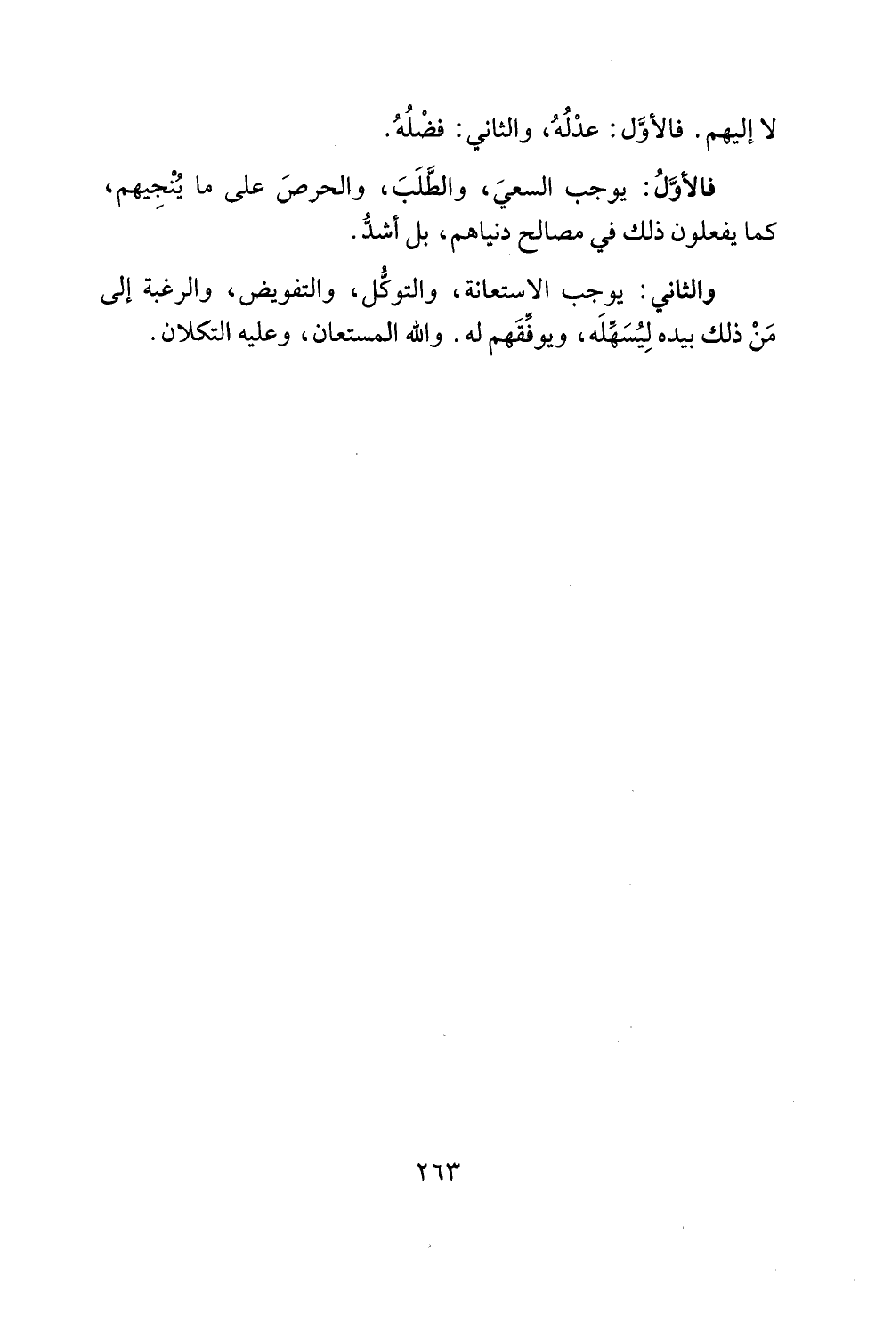 والثاني: يوجب الاستعانة، والتوكُّل، والتفويض، والرغبة إلى مَنْ ذلك بيده لِيُسَهِّلَه، ويوفِّقَهم له. والله المستعان، وعليه التكلان.