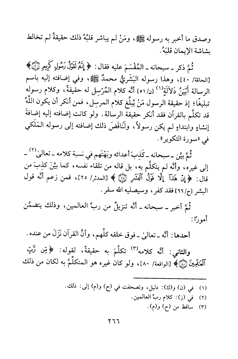 ثُمَّ ذكر -سبحانه- المُقْسَمَ عليه فقال: {إِنَّهُ لَقَوْلُ رَسُولٍ كَرِيمٍ (40)} [الحاقة: 40]، وهذا رسوله البَشَرىُّ محمدٌ - صلى الله عليه وسلم -، وفي إضافته إليه باسم الرسالة أَبْيَنُ دَلاَلَةٍ (¬1) أنَّه كلام المُرْسِل له حقيقةً، وكلام رسوله تبليغًا؛ إذ حقيقة الرسول مَنْ يُبلِّغ كلام المرسِل، فمن أنكر أن يكون اللهُ قد تكلَّم بالقرآن فقد أنكر حقيقة الرسالة. ولو كانت إضافته إليه إضافةَ إنشاءٍ وابتداءٍ لم يكن رسولاً، ولَنَاقَضَ ذلك إضافته إلى رسوله المَلَكي في "سورة التكوير".