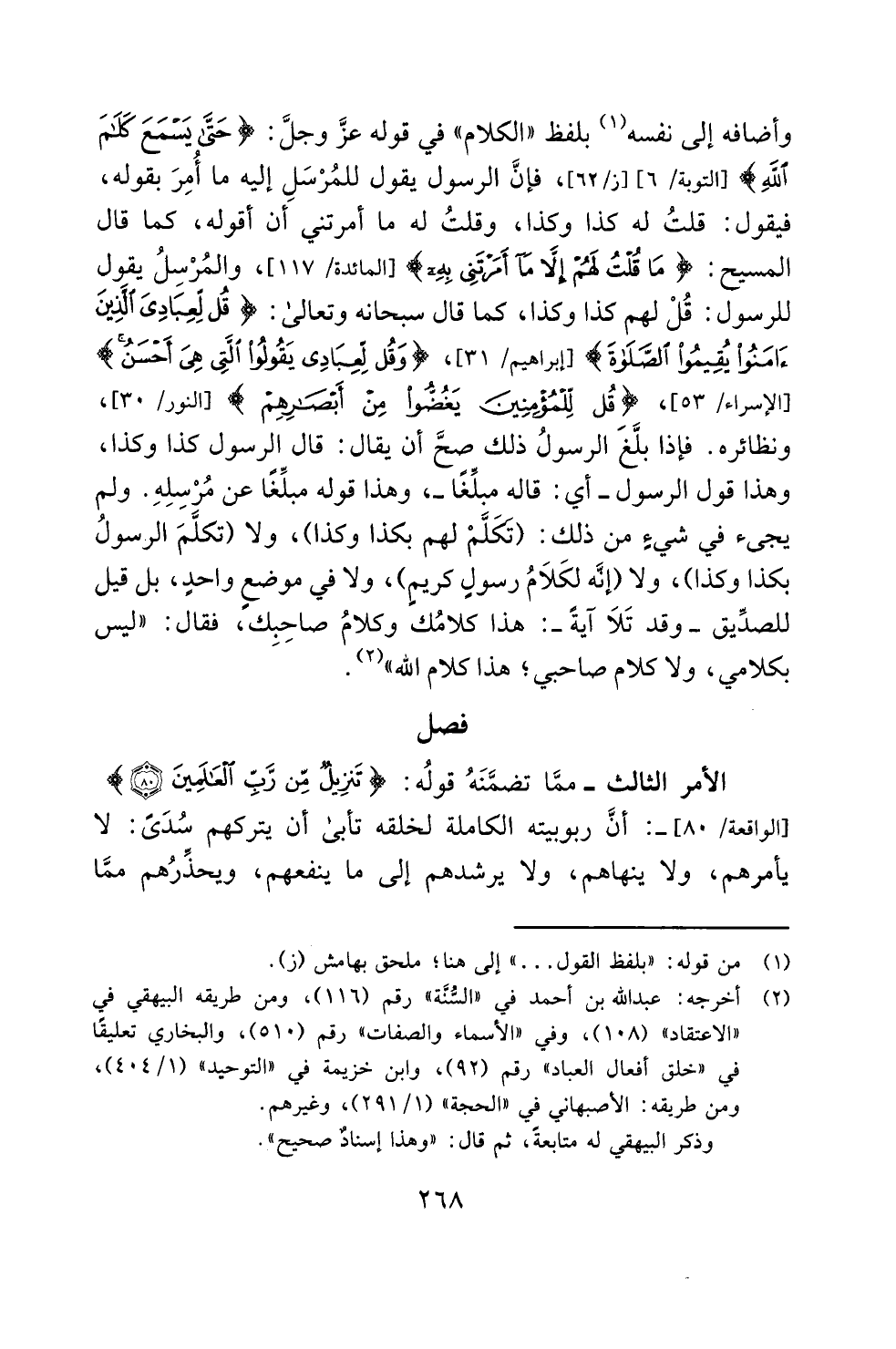 وأضافه إلى نفسه (¬1) بلفظ "الكلام" في قوله -عزَّ وجلَّ-: {حَتَّى يَسْمَعَ كَلَامَ اللَّهِ} [التوبة: 6]، فإنَّ الرسول يقول للمُرْسَلِ إليه ما أُمِرَ بقوله، فيقول: قلتُ له كذا وكذا، وقلتُ له ما أمرتني أن أقوله، كما قال المسيح: {مَا قُلْتُ لَهُمْ إِلَّا مَا أَمَرْتَنِي بِهِ} [المائدة: 117]، والمُرْسِلُ يقول للرسول: قُلْ لهم كذا وكذا، كما قال سبحانه وتعالى: {قُلْ لِعِبَادِيَ الَّذِينَ آمَنُوا يُقِيمُوا الصَّلَاةَ} [إبراهيم: 31]، {وَقُلْ لِعِبَادِي يَقُولُوا الَّتِي هِيَ أَحْسَنُ} [الإسراء: 53]، {قُلْ لِلْمُؤْمِنِينَ يَغُضُّوا مِنْ أَبْصَارِهِمْ} [النور: 30]، ونظائره. فإذا بلَّغَ الرسولُ ذلك صحَّ أن يقال: قال الرسول كذا وكذا، وهذا قول الرسول- أي: قاله مبلِّغًا-، وهذا قوله مبلِّغًا عن مُرْسِلِهِ. ولم يجئ في شيءٍ من ذلك: (تَكلَّمْ لهم بكذا وكذا)، ولا (تكلَّمَ الرسولُ بكذا وكذا)، ولا (إنَّه لكَلاَمُ رسولٍ كريمٍ)، ولا في موضعٍ واحدٍ، بل قيل للصدِّيق -وقد تَلاَ آيةً-: هذا كلامُك وكلامُ صاحِبِك، فقال: "ليس بكلامي، ولا كلام صاحبي؛ هذا كلام الله" (¬2).