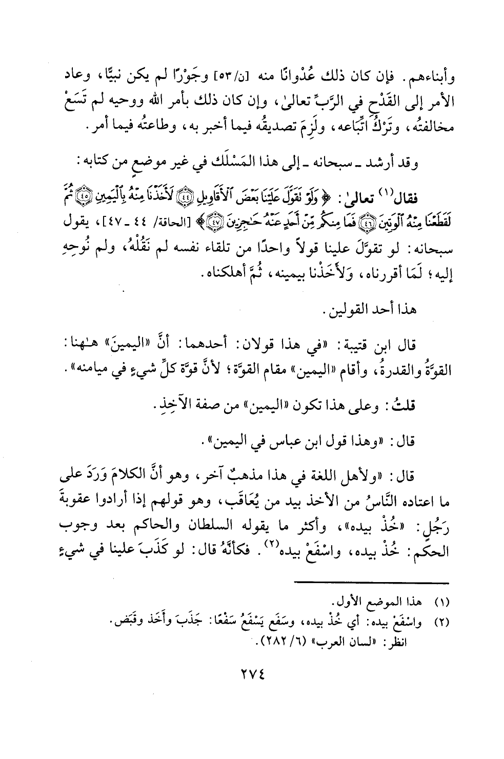 قال: "ولأهل اللغة في هذا مذهبٌ آخر، وهو أنَّ الكلامَ وَرَدَ على ما اعتاده النَّاسُ من الأخذ بيد من يُعَاقَب، وهو قولهم إذا أرادوا عقوبةَ رَجُلٍ: "خُذْ بيده"، وأكثر ما يقوله السلطان والحاكم بعد وجوب الحكم: خُذْ بيده، واسْفَعْ بيده (¬2). فكأنَّهُ قال: لو كَذَبَ علينا في شيءٍ