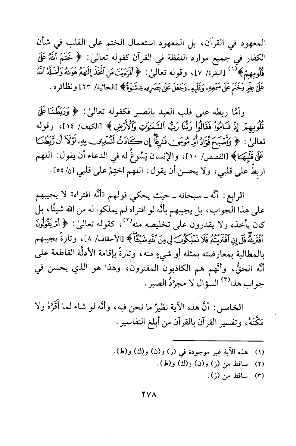 المعهود في القرآن، بل المعهود استعمال الختم على القلب في شأن الكفار في جميع موارد اللفظة في القرآن كقوله تعالى: {خَتَمَ اللَّهُ عَلَى قُلُوبِهِمْ} (¬1) [البقرة: 7]، وقوله تعالى: {أَفَرَأَيْتَ مَنِ اتَّخَذَ إِلَهَهُ هَوَاهُ وَأَضَلَّهُ اللَّهُ عَلَى عِلْمٍ وَخَتَمَ عَلَى سَمْعِهِ وَقَلْبِهِ وَجَعَلَ عَلَى بَصَرِهِ غِشَاوَةً} [الجاثية: 23] ونظائره.