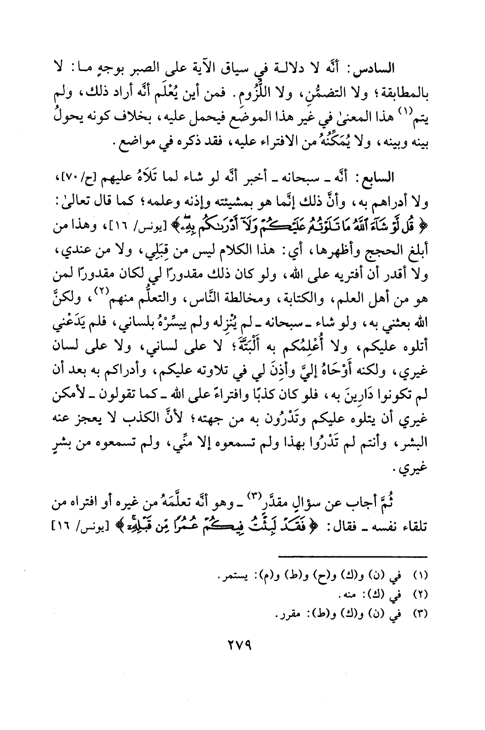 السادس: أنَّه لا دلالة في سياق الآية على الصبر بوجهٍ ما: لا بالمطابقة؛ ولا التضمُّنِ، ولا اللُّزُومِ. فمن أين يُعْلَم أنَّه أراد ذلك، ولم يتم (¬1) هذا المعنى في غير هذا الموضع فيحمل عليه، بخلاف كونه يحولُ بينه وبينه، ولا يُمَكِّنُهُ من الافتراء عليه، فقد ذكره في مواضع.